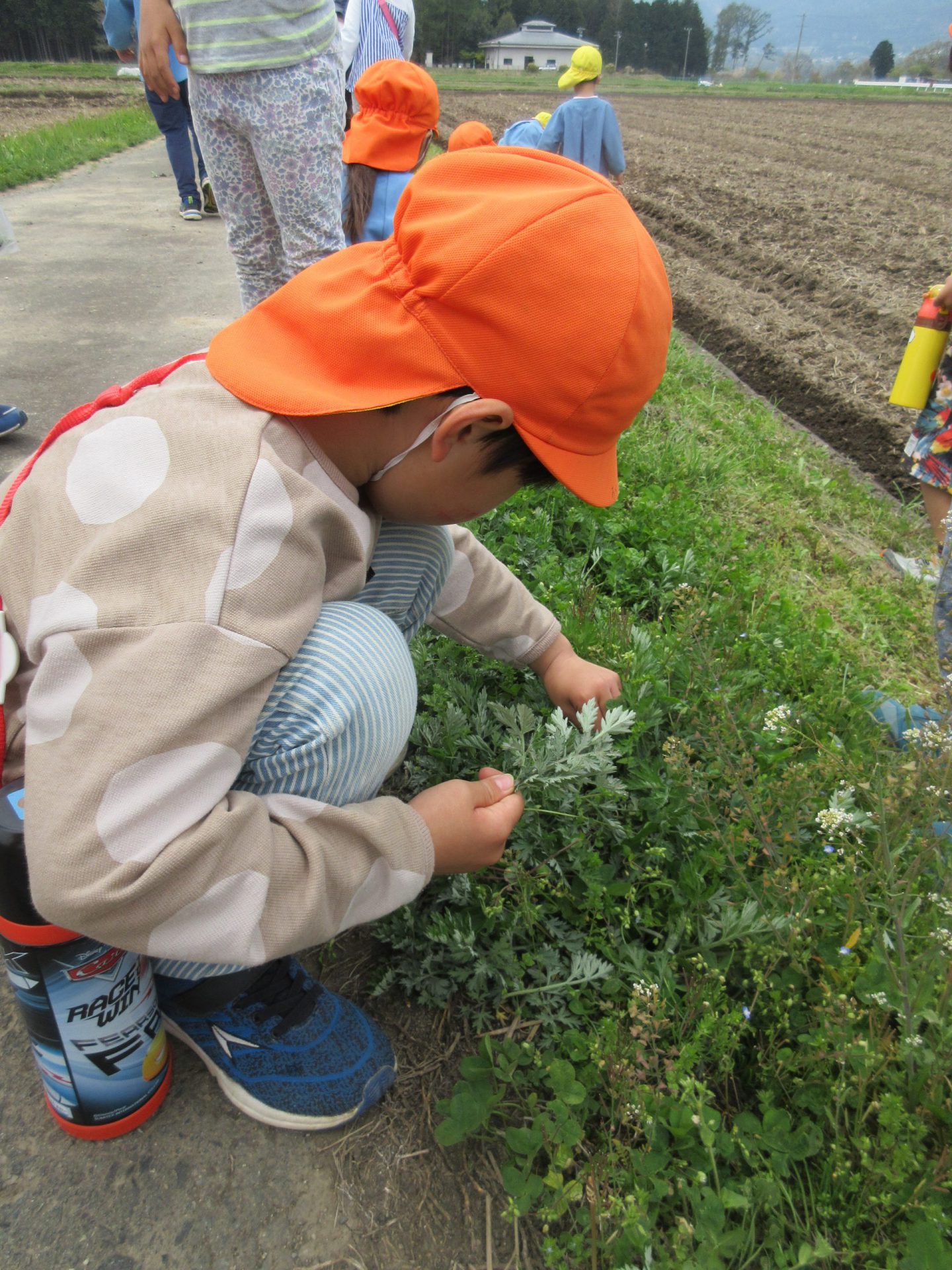 年長さんは、草餅を作るため、ヨモギ探しに、古墳公園の先に出発