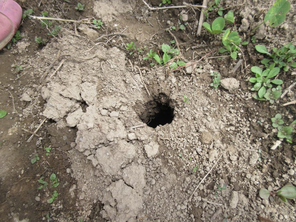 ヨモギを摘んでいると「なんの穴?」「へび?」「もぐら?」「なんか細いじゃん!」「あっちにつながってるに」