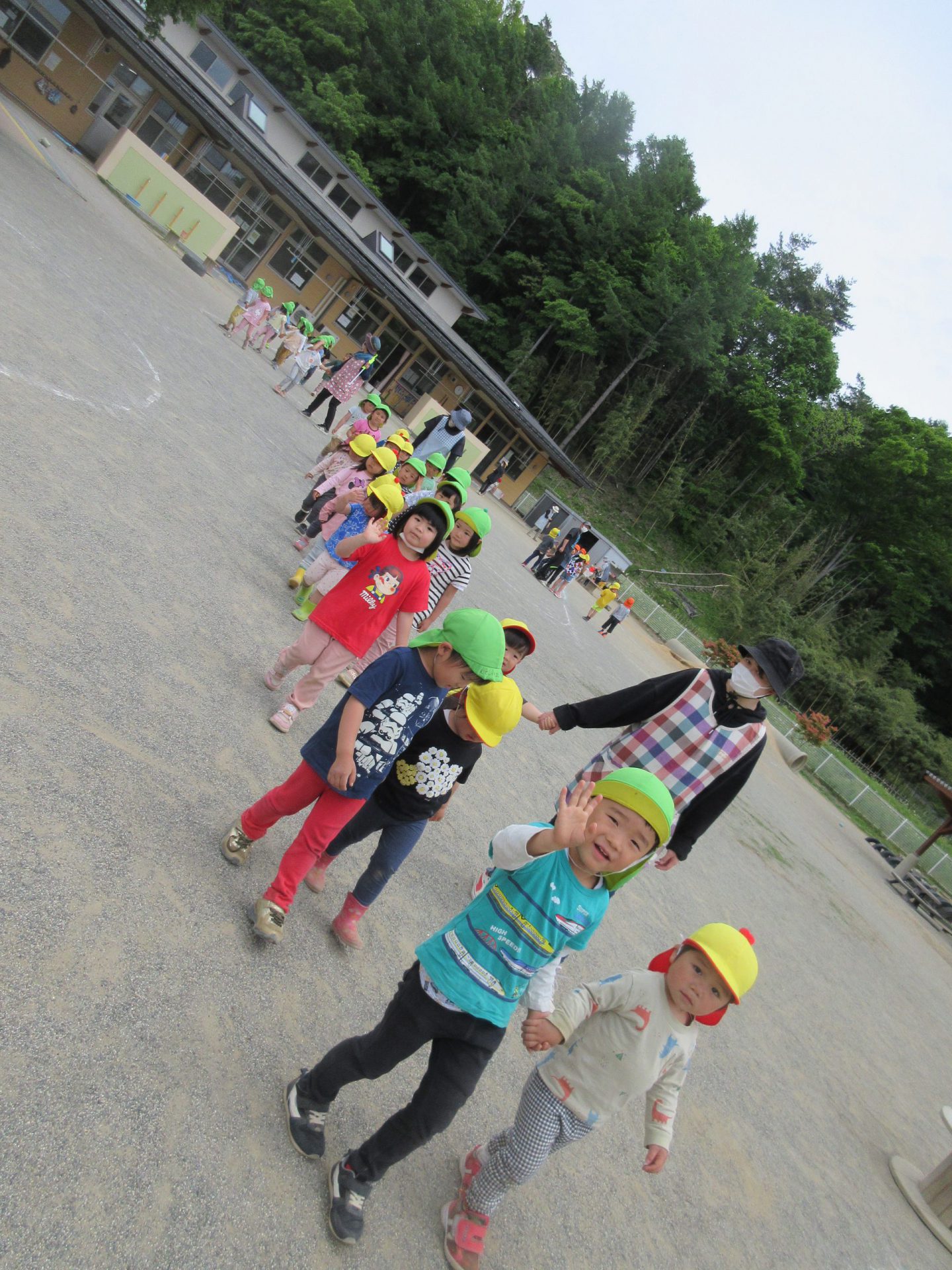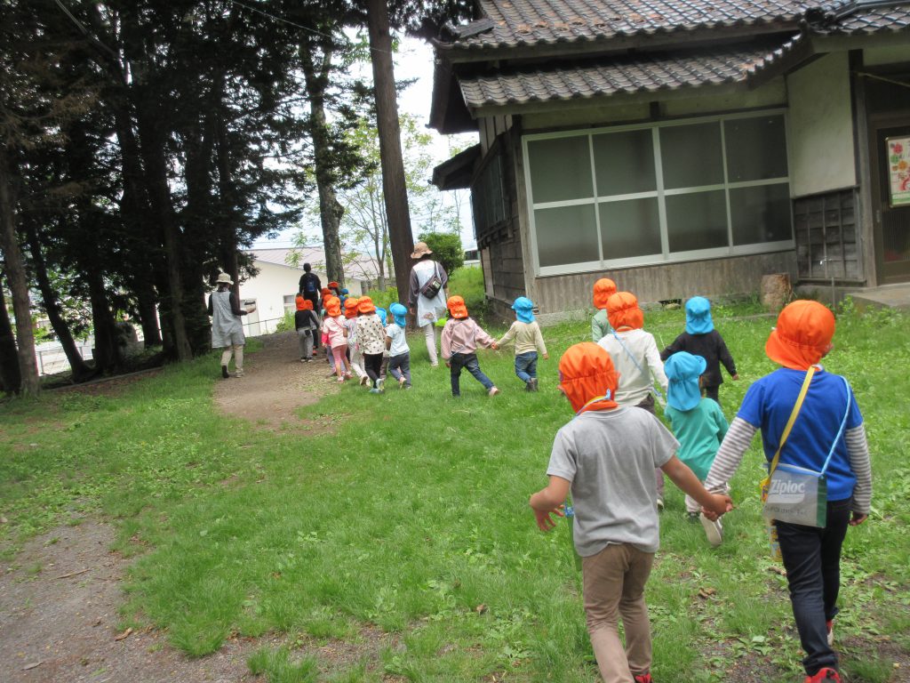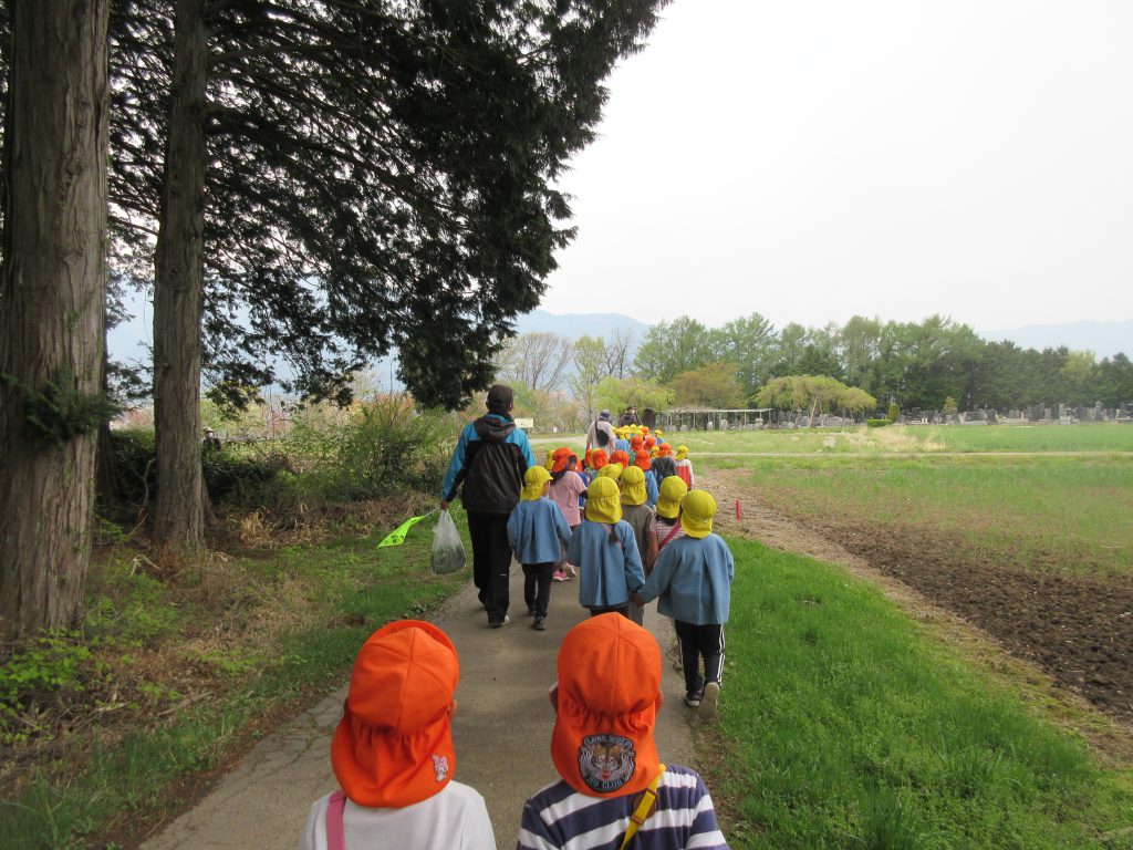 これからは散歩の楽しい季節ですね。年中さんが未満児さんと手をつないで歩いてみます。誰も手をつなぐことを嫌がらないのです。日頃庭で一緒に遊んでいるからなのかなあ😊