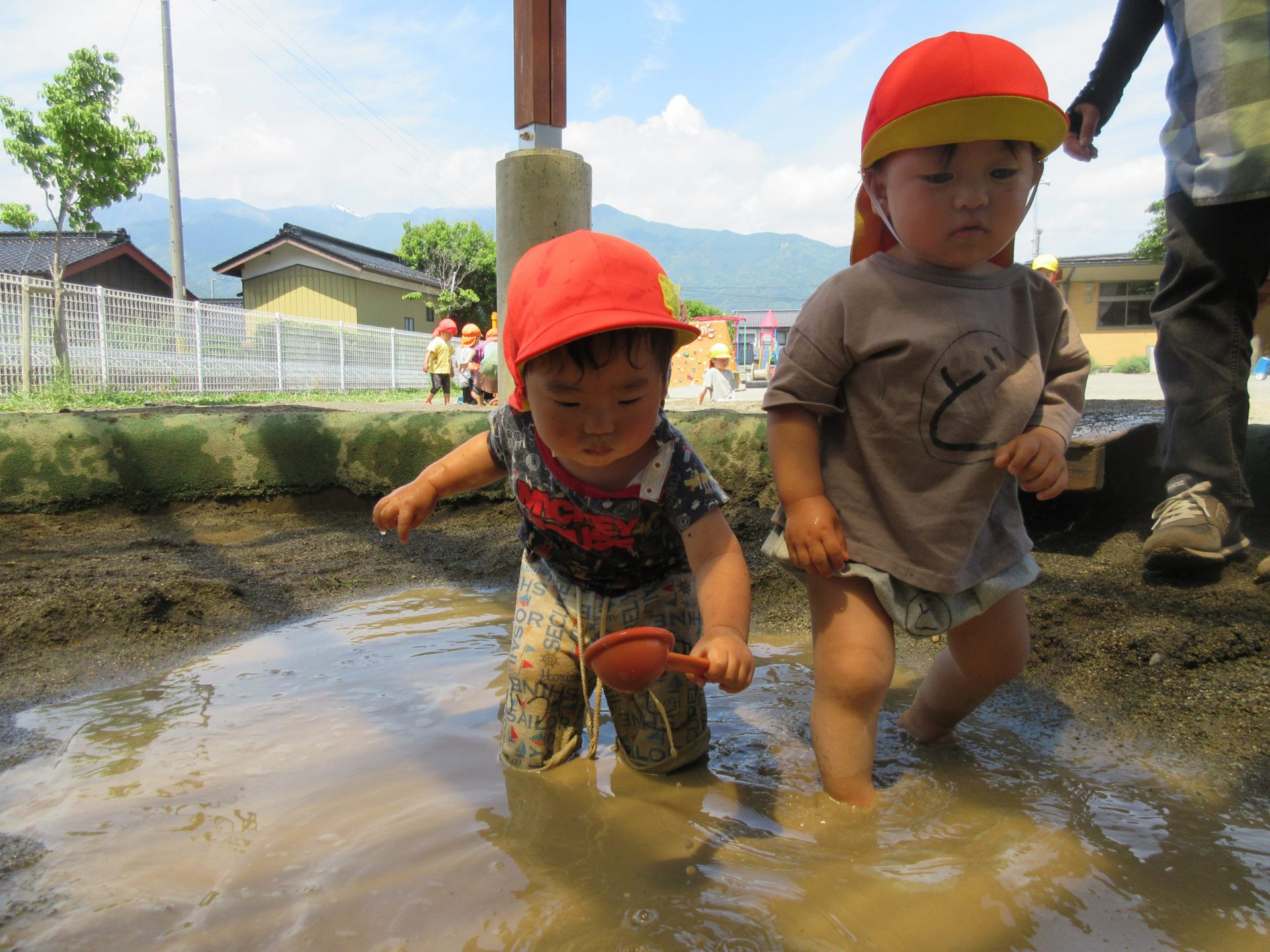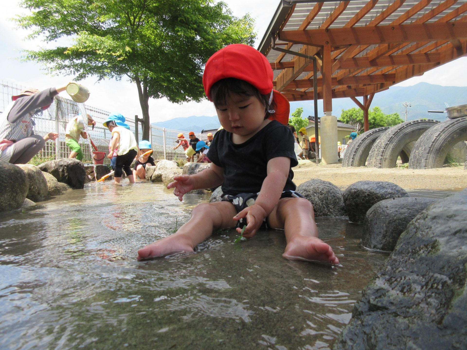 せせらぎの水が砂場へ…深いぞ~