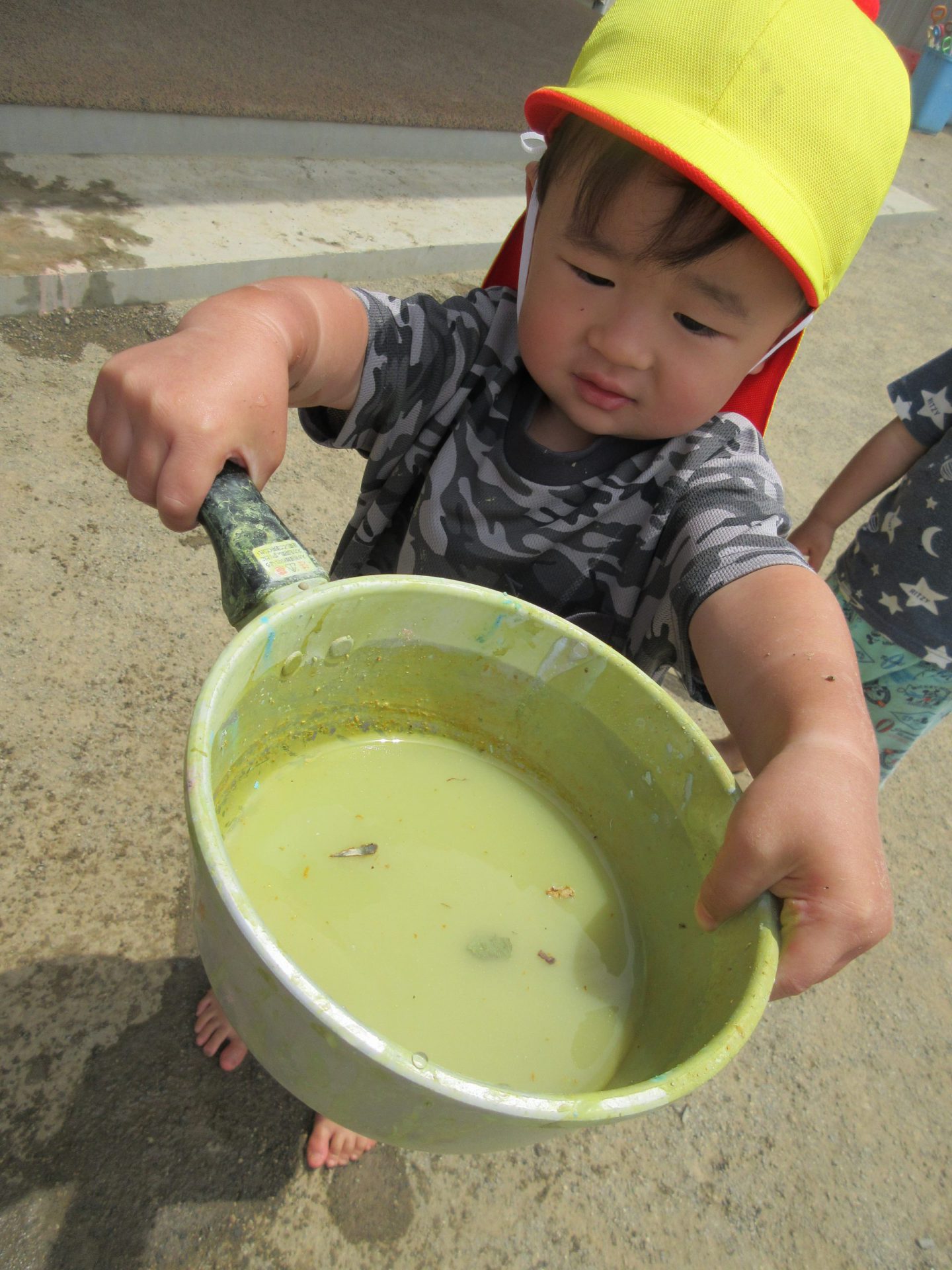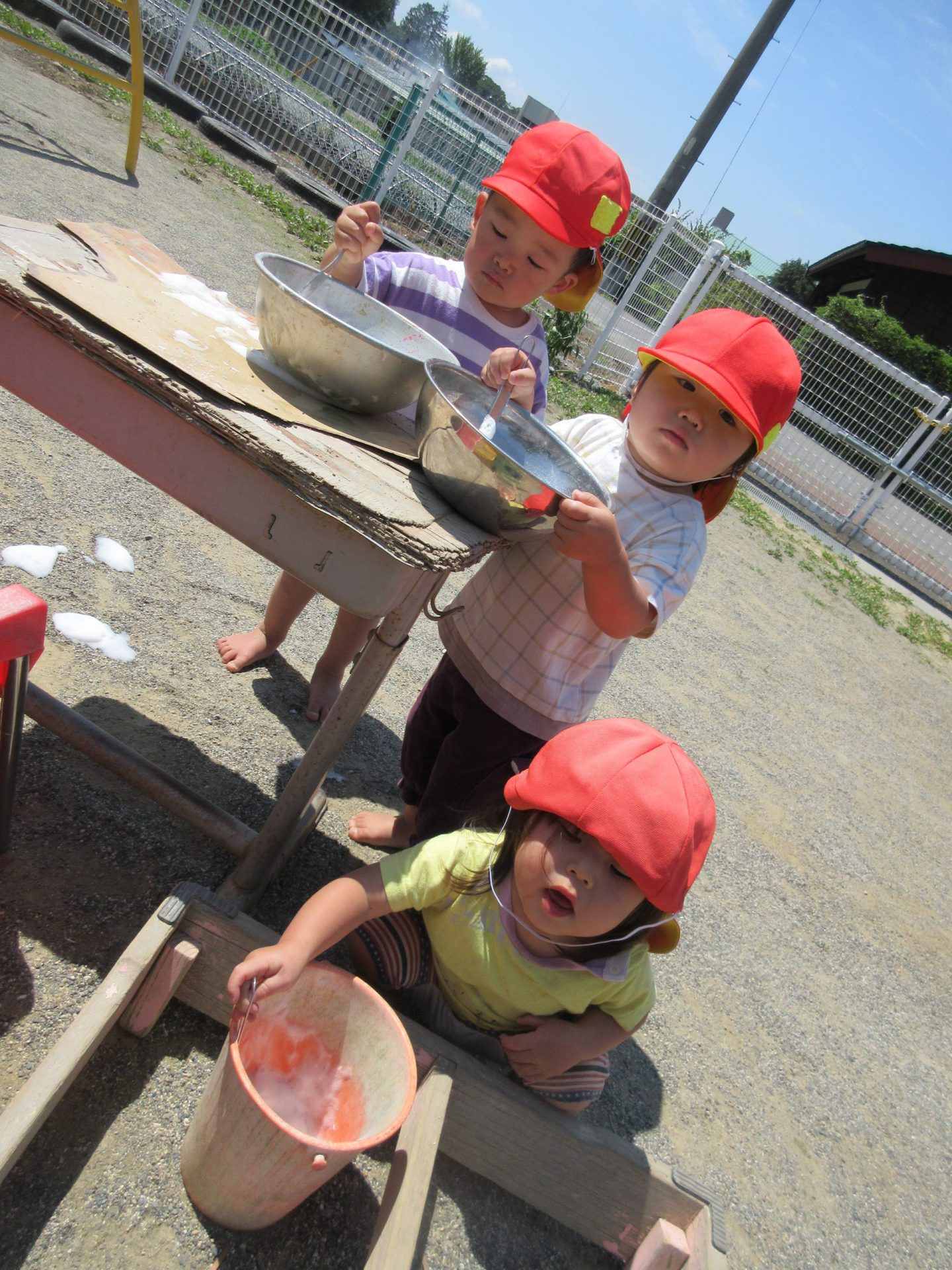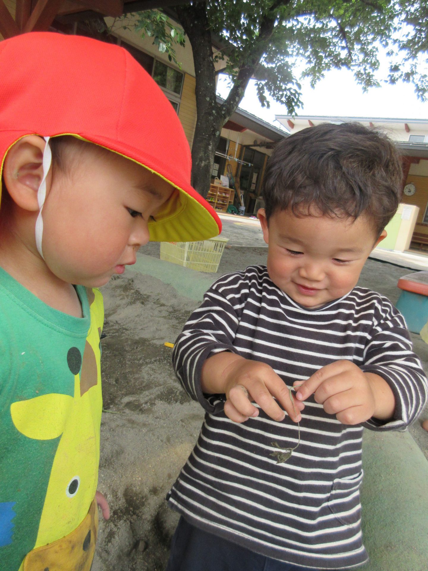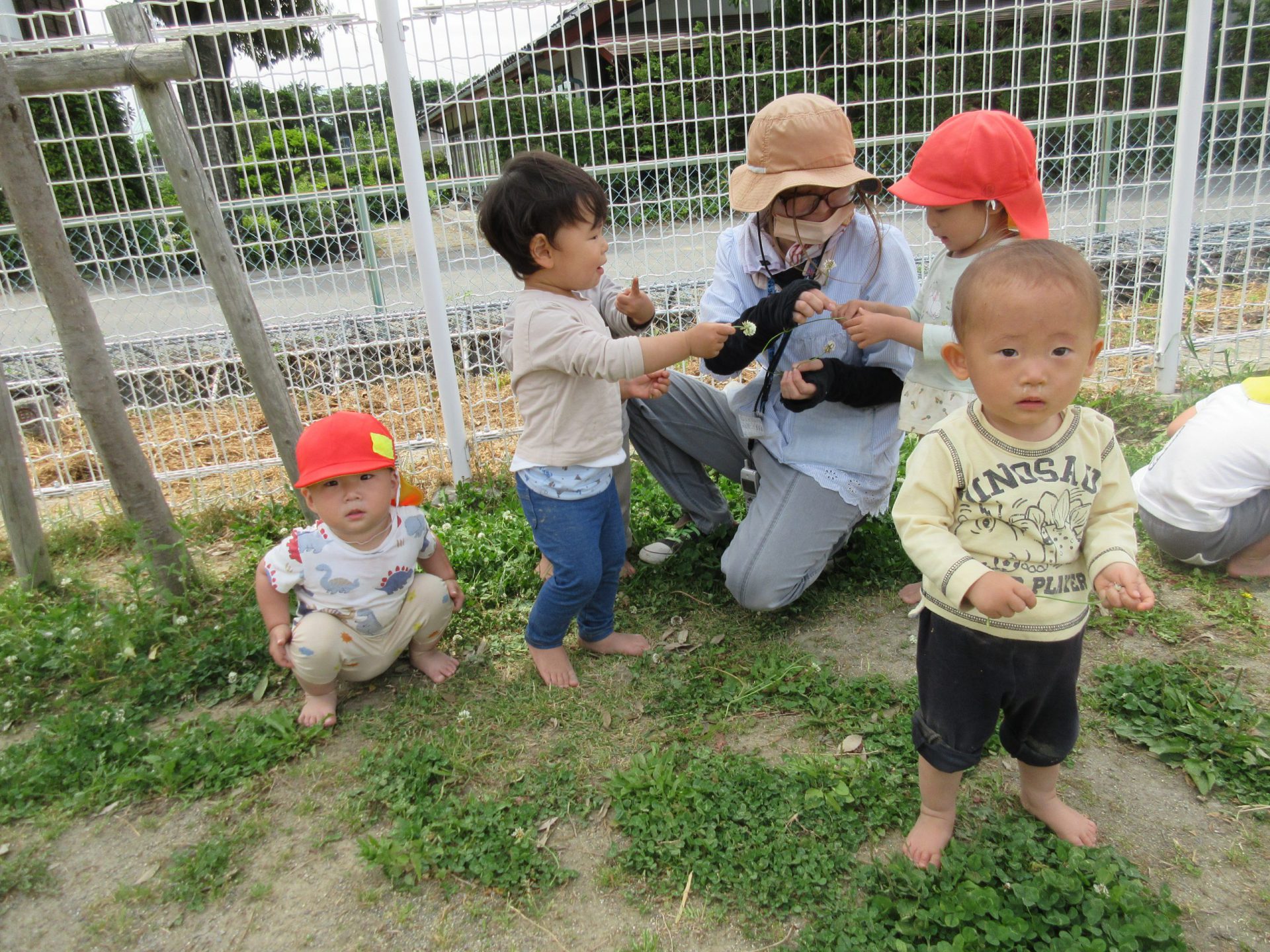 大きな子たちが出かけた後の庭を未満児さんたちが遊びます。大きい子たちの真似をして遊び始めます。「せんせー、これなあに?」