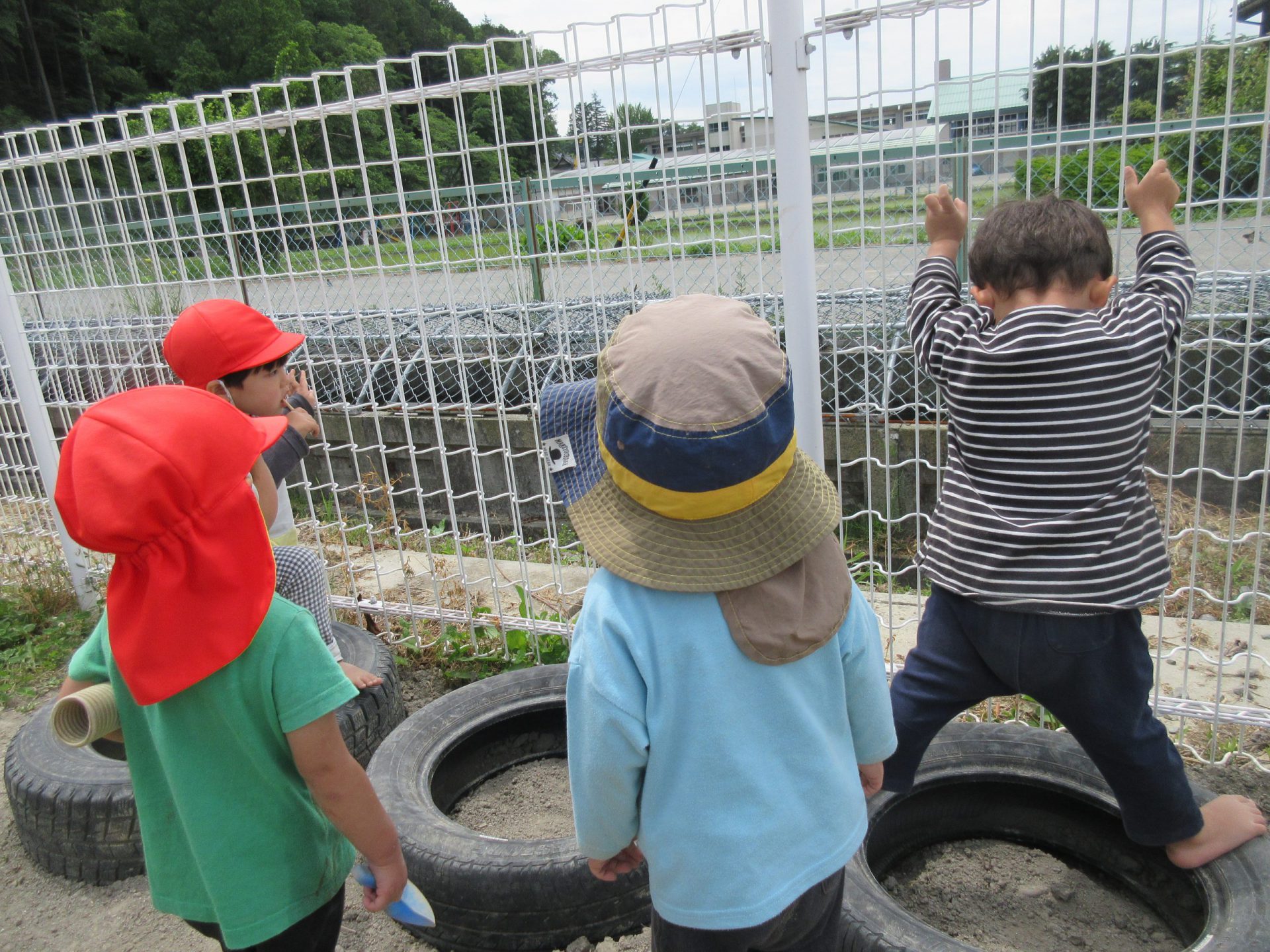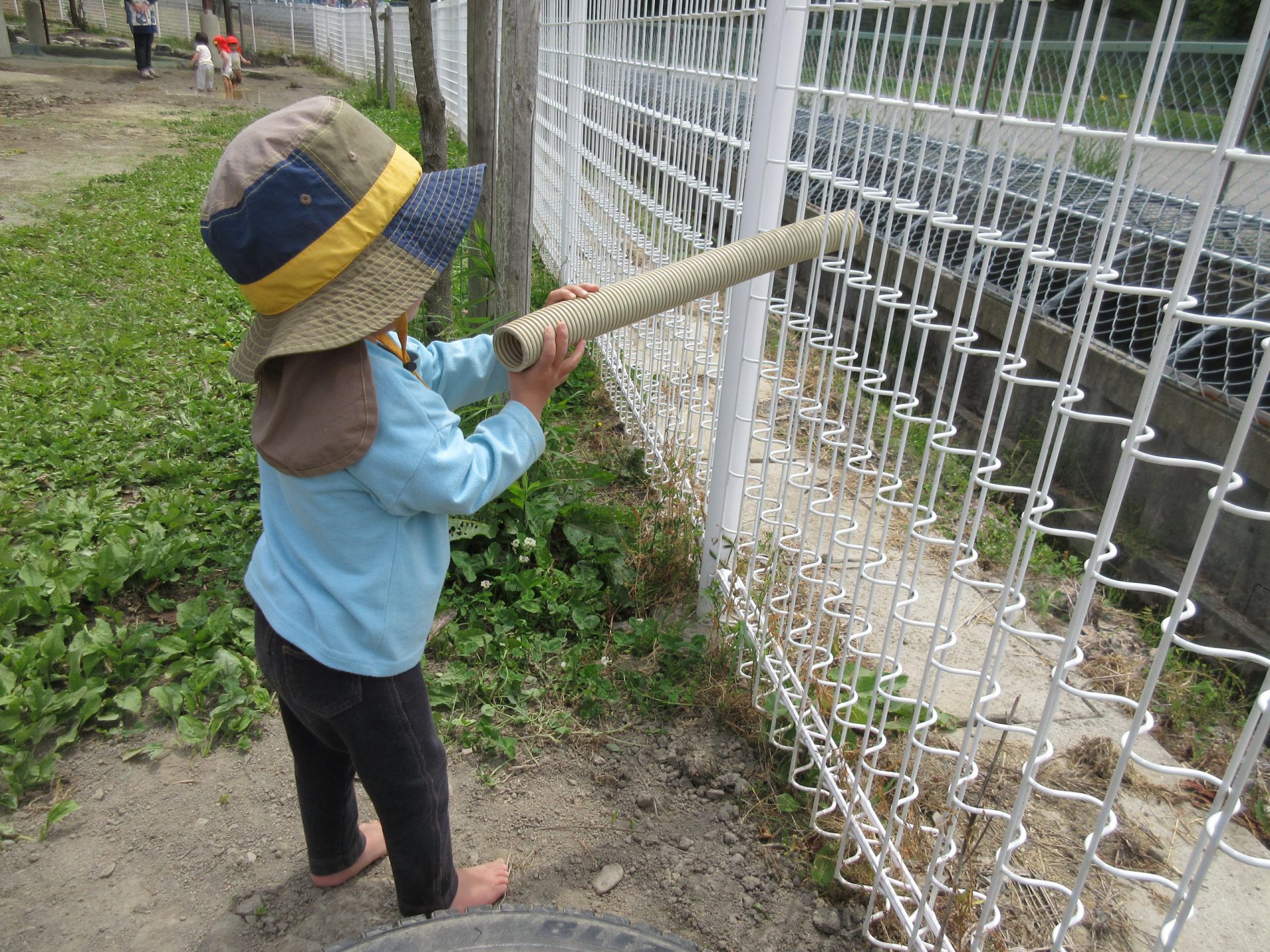保育士が近くに落ちてたヒューム管で見えるかなあ?とみたところ、ぼくもぼくも!と真似っこです