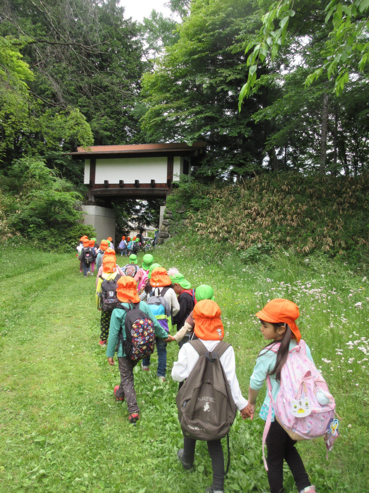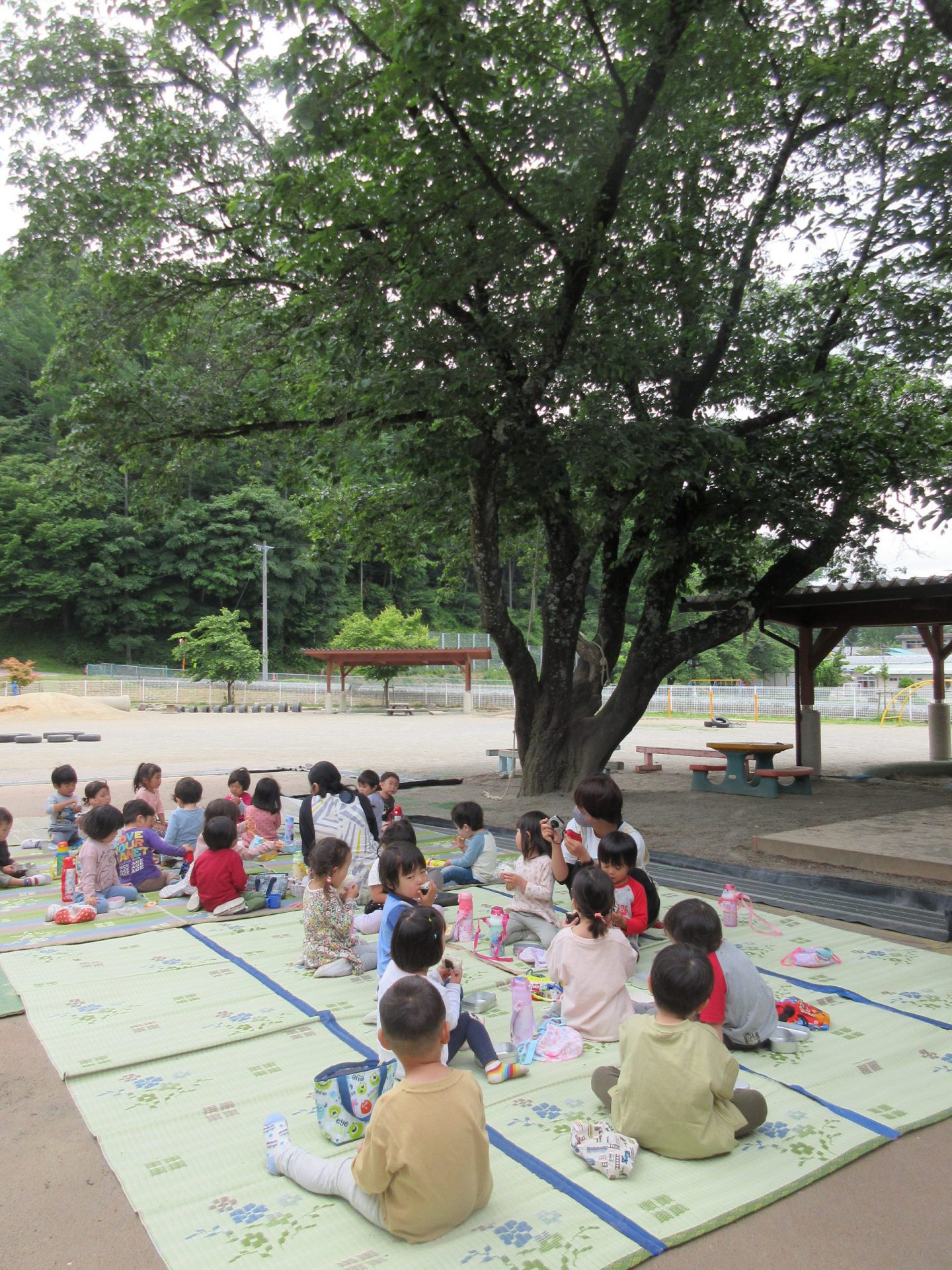 お家の方におにぎりを作っていただいて遠足にいこう!!と計画しましたが、27日金曜日は雨!と天気予報。そんな…。よし、26日木曜日にもおにぎりを作っていただき、お散歩へいってこよう!年中・長さんは殿島城址公園へ!!ブランコ や大型遊具、広い草っぱら。追いかけっこも楽しいね
