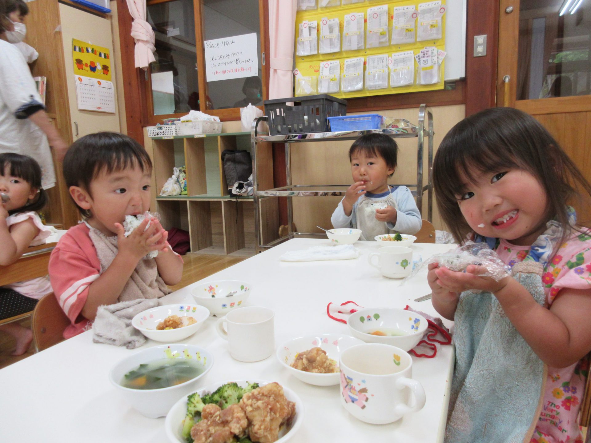 お兄ちゃんたちいいなあうらやましそうに見ていた2歳さん。給食の先生が🍙つくってくれたんだよね。いっぱいいっぱい食べました