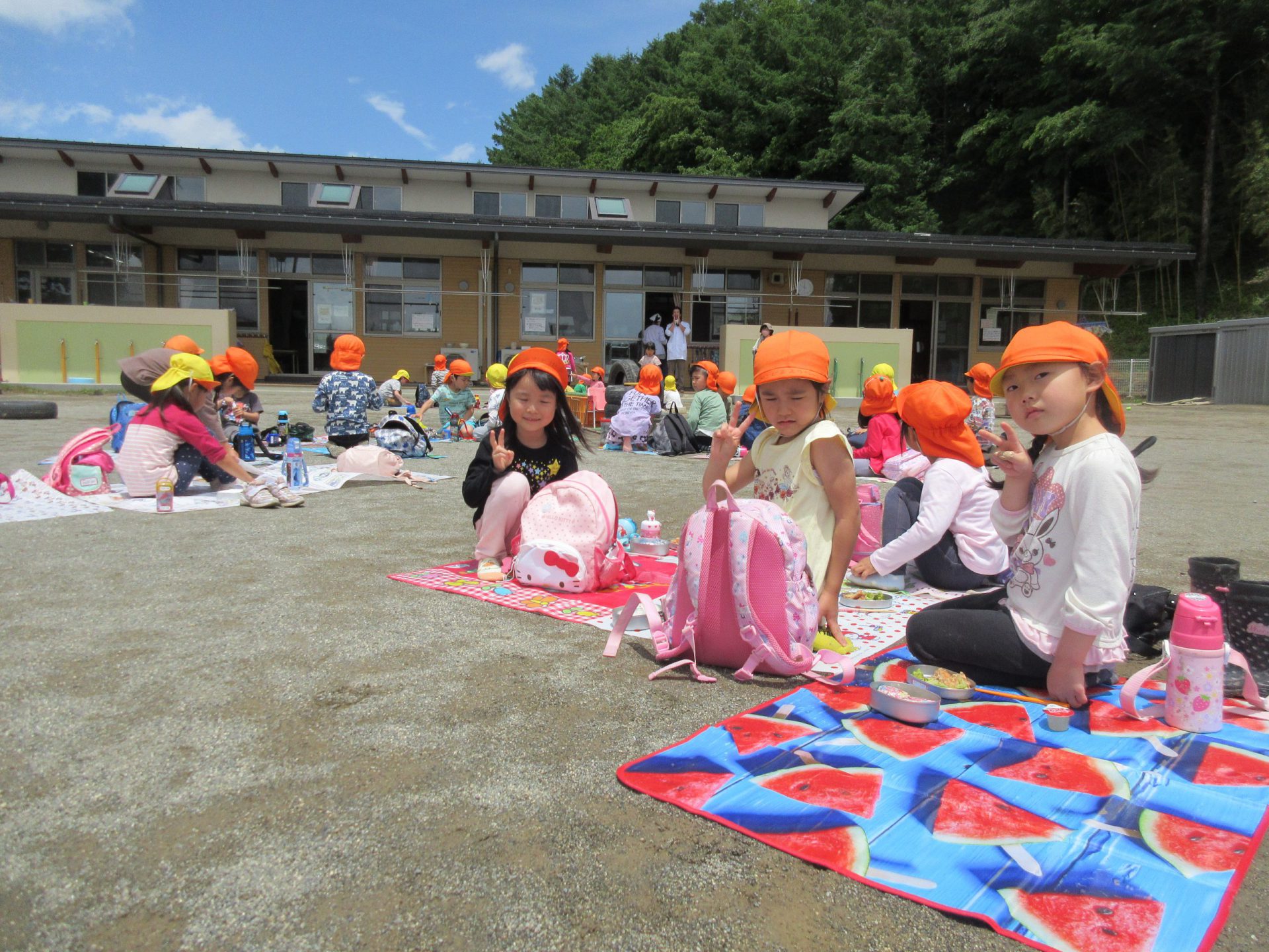 お楽しみのお昼は🍙、からあげ ブロッコリー ゼリー保育園シンボルツリー桜の木の下で