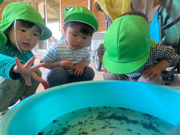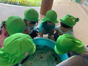 「オタマジャクシ!い~っぱい いたね~!!」そうそう!タライの中には、園長先生のお家からきた、オタマジャクシがい~っぱい!!いるんだよね。