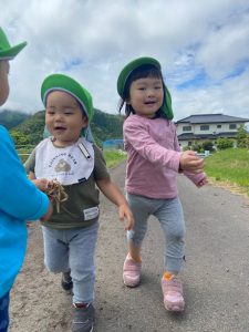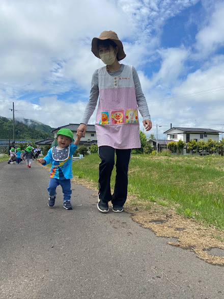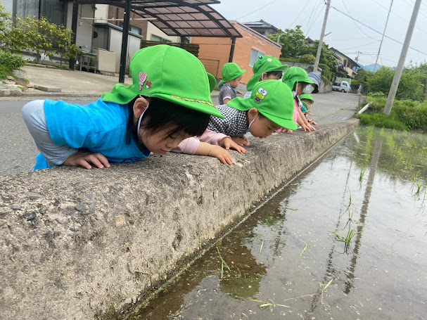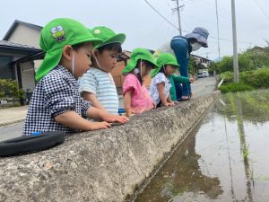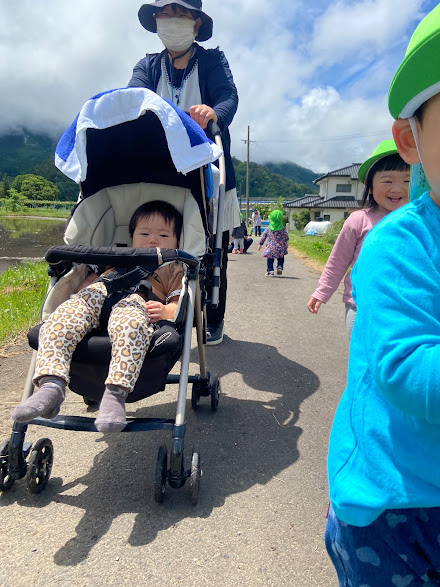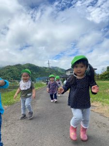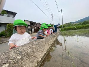「よ~し!近くの田んぼまで、オタマジャクシに会いに行こう!!」ひよこ組、みんなでお散歩に出掛けます。安全な場所は、お散歩リングを離して進みます。