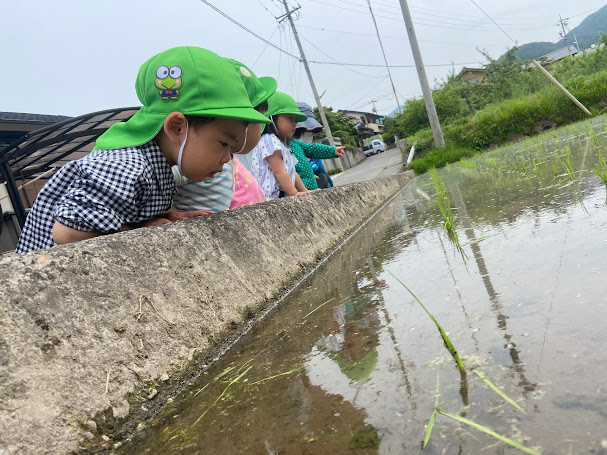さぁ、田んぼに到着!!「いたかな~?いたかな~?オタマジャクシさん!!」じっくり見つめます。