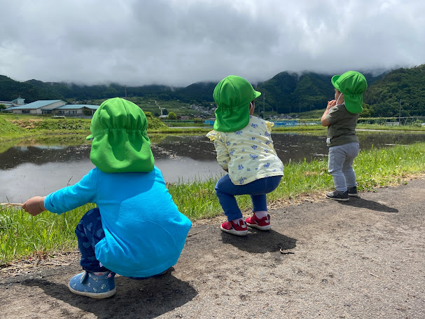 立ち止まった子ども達の目線の先に見えるのは・・・田んぼ。「おーい!オタマジャクシさ~ん!!」って言っているようです。(そう背中が言っていました・・・。)