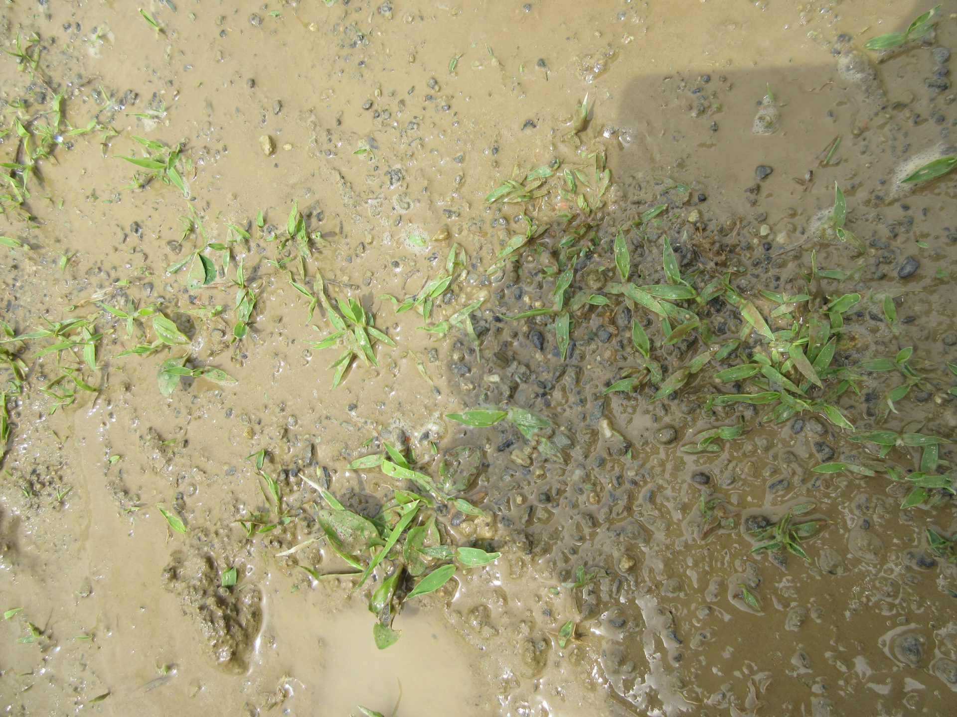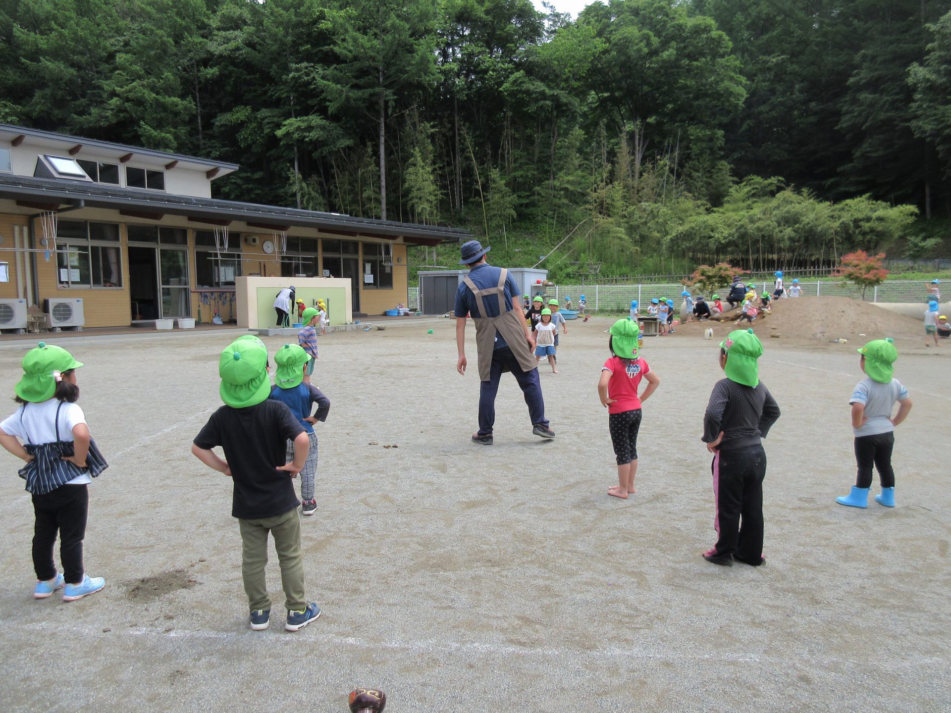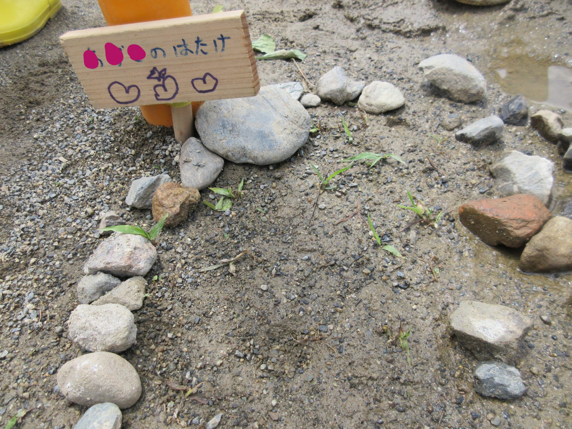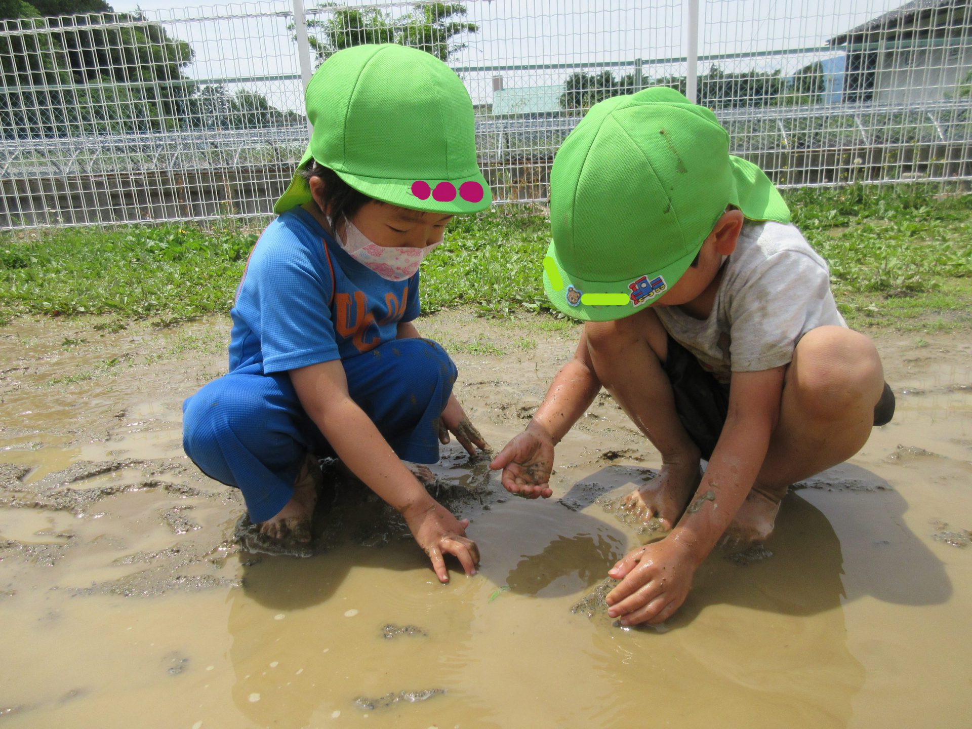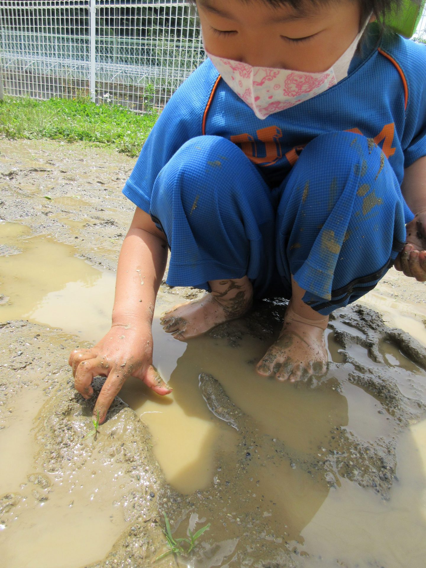 AちゃんがS君に「こうやって(指で穴をあけて)したら、草をいれて、こうするの。(両手で植えた草が倒れないようにするしぐさは… お田植えだ!)保「もしかしてお田植えしているの?」A「うん!そうだよ。まえね、じいちゃんと、おたうえしたんだよ!」