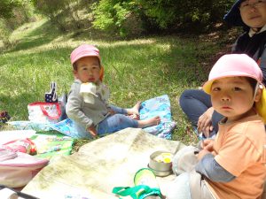 かくれんぼ、蟹さがし、おままごと思いおもいに2時間ほど遊び「おなかすいた」の声。 お待ちかねのお弁当です。お山で食べるお弁当、おいしいね。