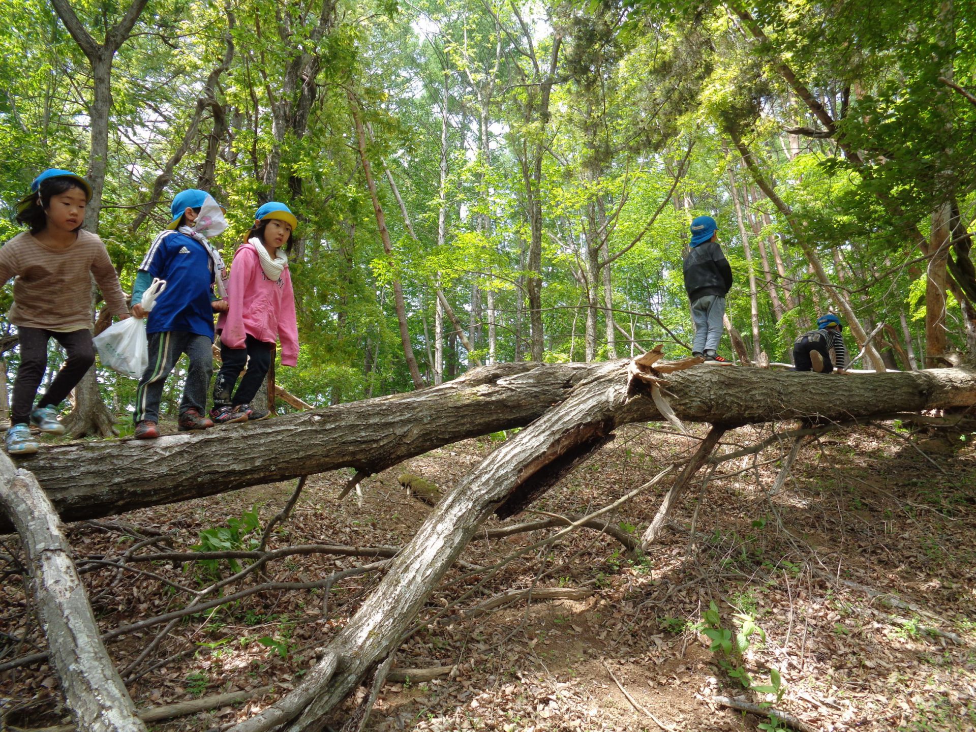 午後も一番大きい年長さんだけは山に残って遊びます。 「恐竜みたいな木、落ちないでわたれるか」 挑戦するかしないか、自分で決めます。