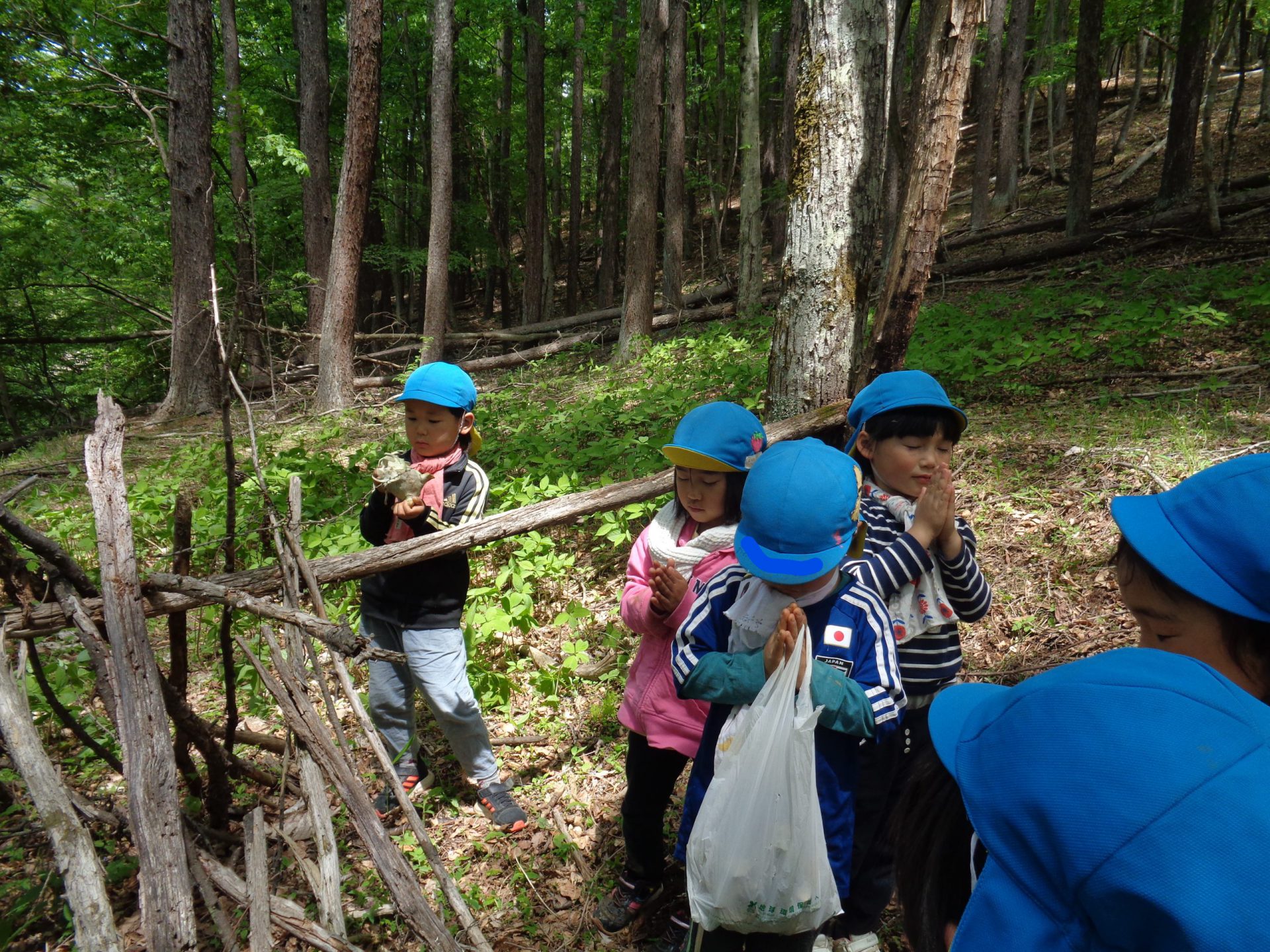 遊び疲れたころ、「鹿の骨だ」 白骨を発見。「歯がついている」「これはどこの骨だ」「どうしてここで死んだのかな?けんかしたのかな。他の動物にやられたのかな」 大切に袋に入れてお土産に。 そしてみんなで「なむ~」 充実の一日でした。