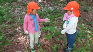 「発見!これなんだろう?」 早速、見つけたよ。「これ毒なんだよ。」「えー。よく知ってるね。じゃあ、今日はそーと見ようね。」園に帰って調べるとマムシクサ、根に毒があるとわかりました。