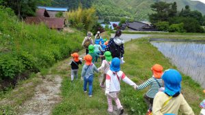 「おにぎり食べたい!」 いっぱい遊んだね。帰り道は「おにぎり食べたい、おにぎり食べたい」の大合唱。お家の人が作ってくれた美味しいおにぎり食べようね♪