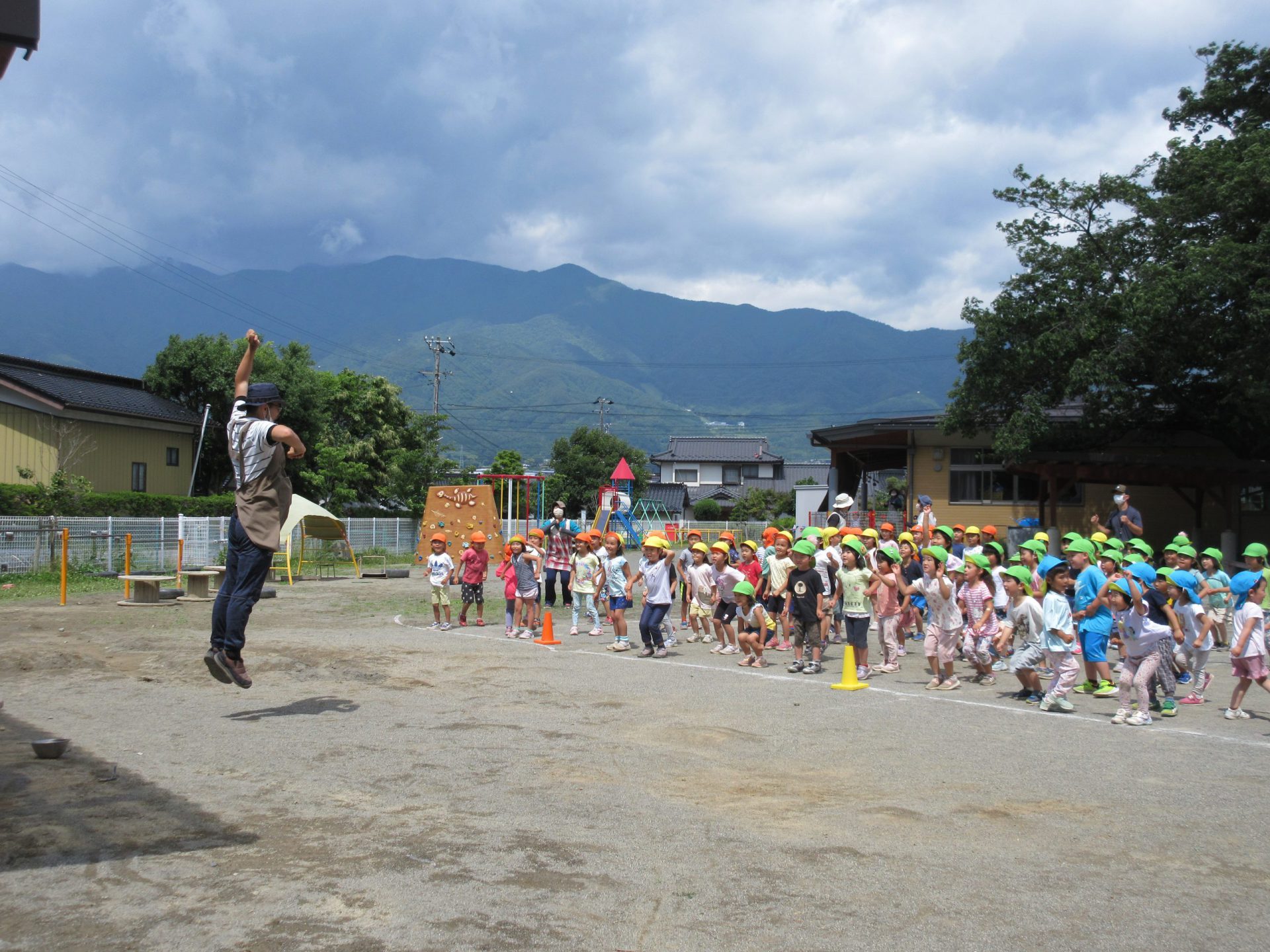 今日は6月生まれのお友だちの誕生日会 皆で運動会ごっこです。 まずは体操。みんなでジャンプ!