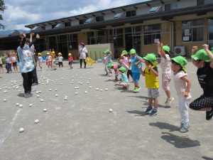 片づけ競争では、最後、一つこぼれた玉を拾ってくれたI君のナイスプレーで白の勝ち!「やった~」