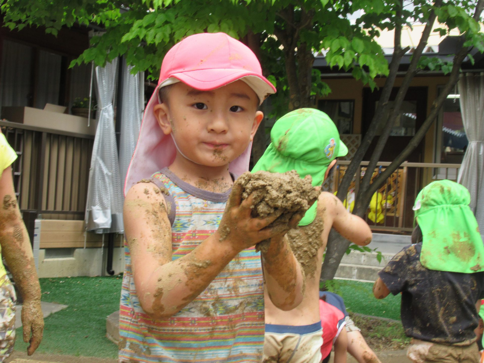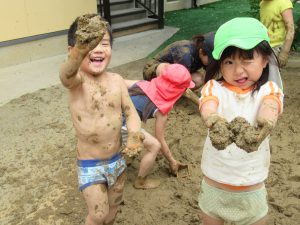 泥んこ遊びは、泥で思い思いに造形を楽しんだり、泥に手足を浸からせて遊ぶことになります。子どもたちの体も服も泥だらけになりますが、子どもは体をめいっぱい動かして、泥の感覚を楽しみ、五感の発達を養うことができます。五感のなかでも特に刺激されるのが、触覚です。
