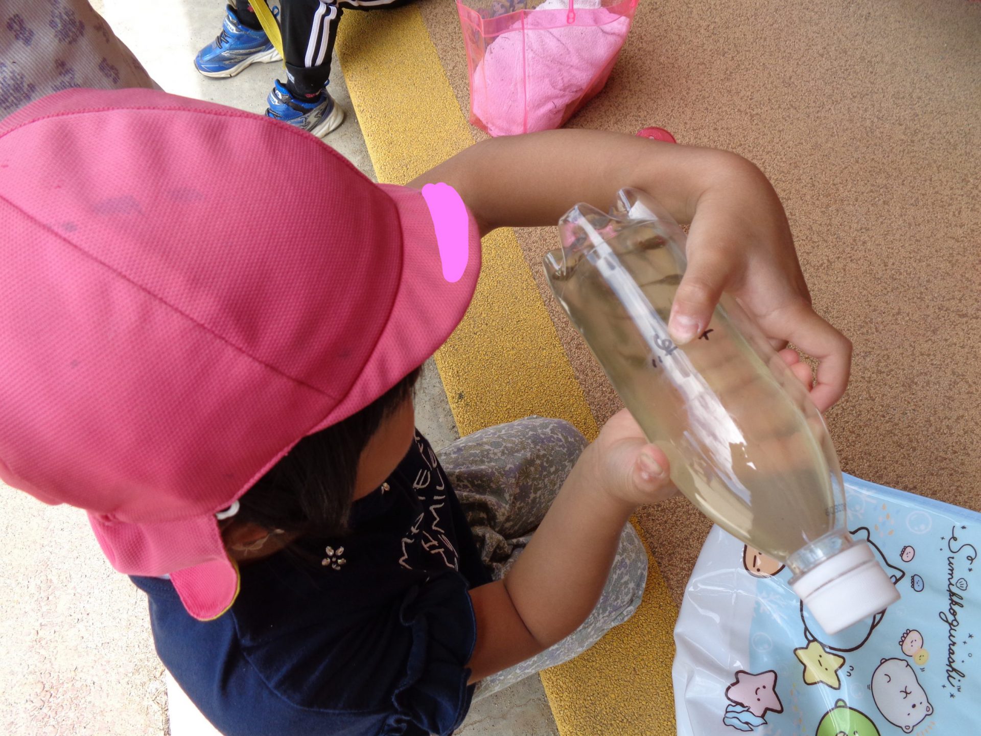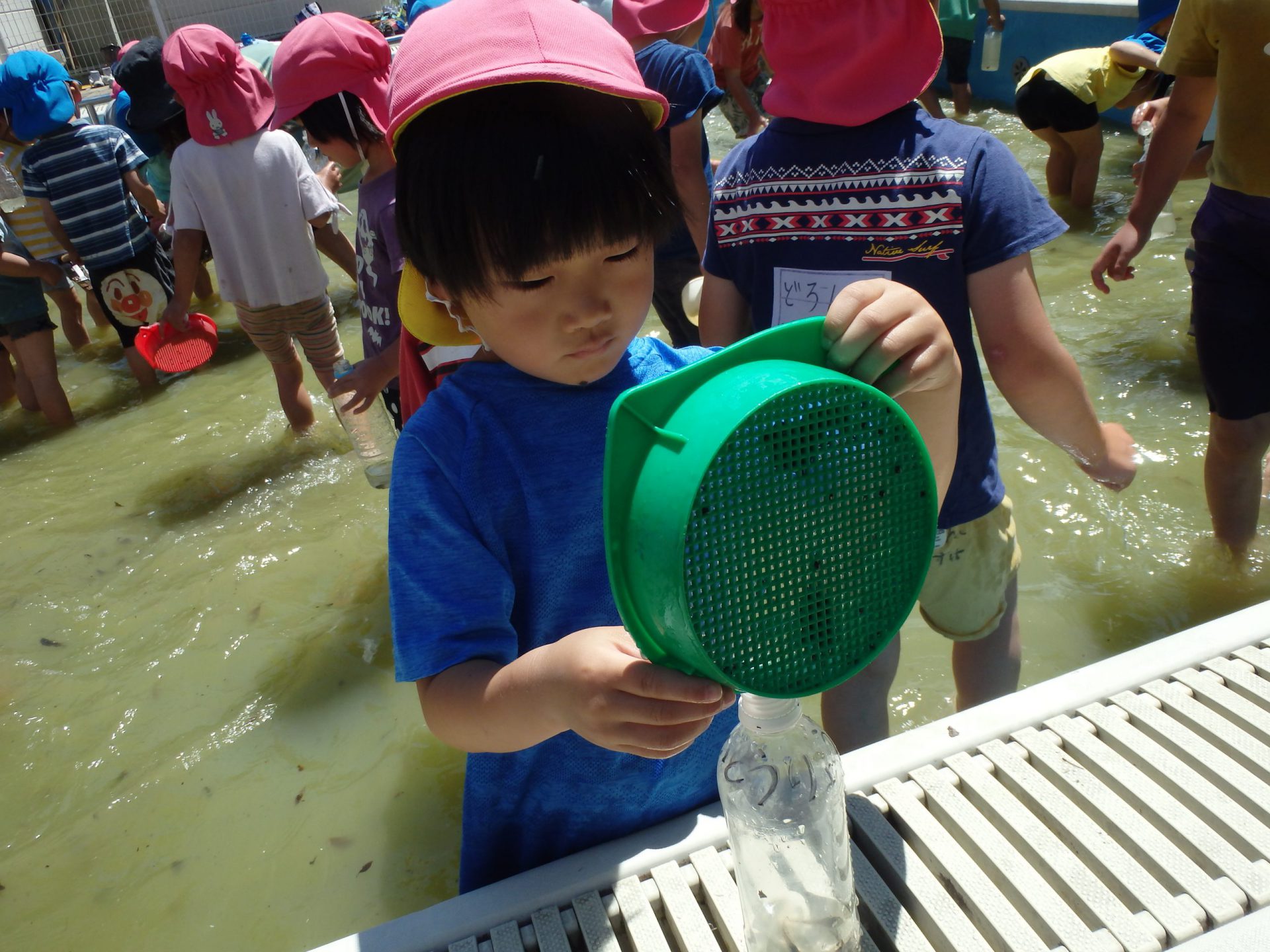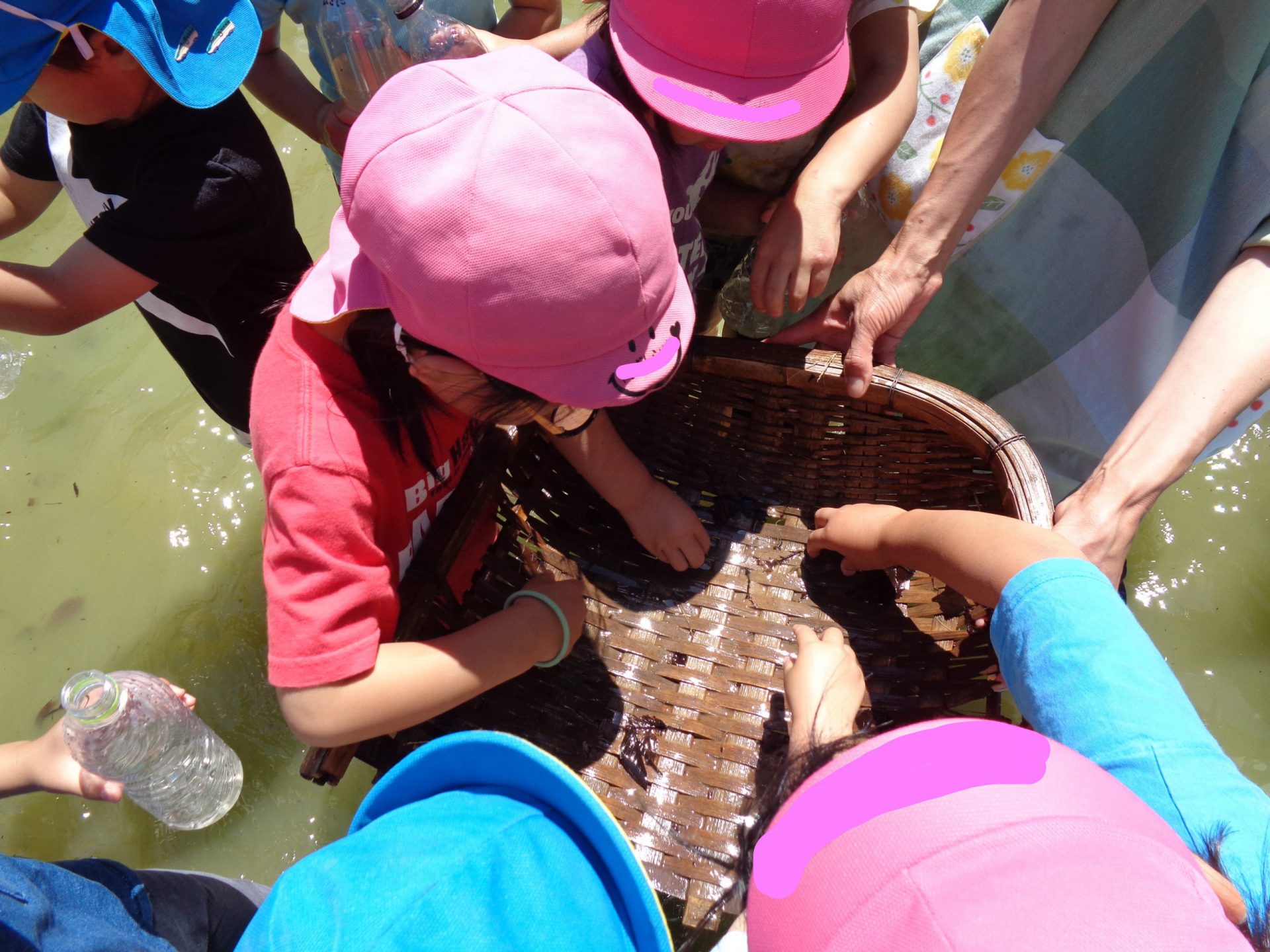近くにいっぱいいるのに取れないから、ふるいやカップを使って見たよ。先生の竹箕にたくさん入ったよ!!ちょーだい ちょーだい!!