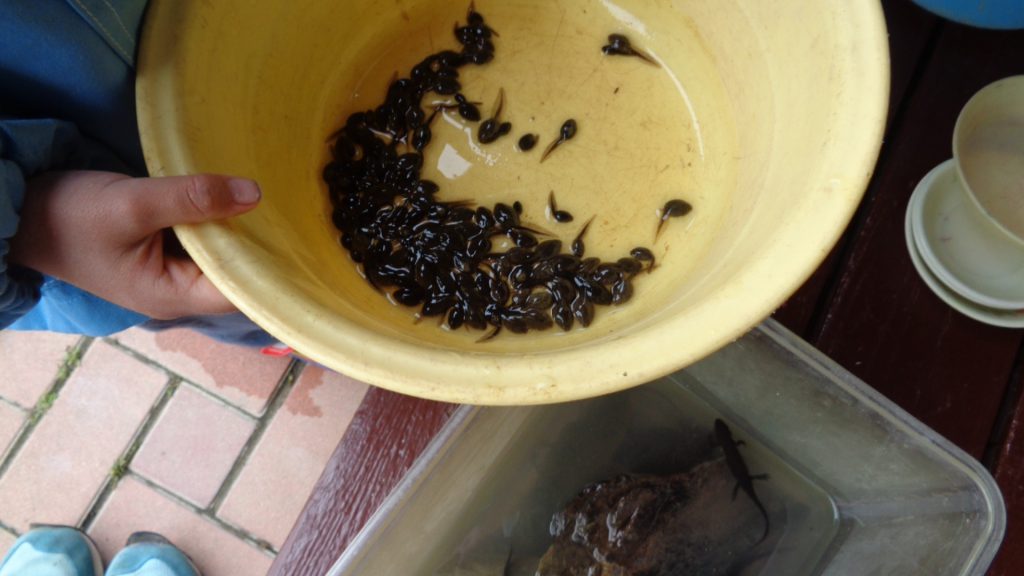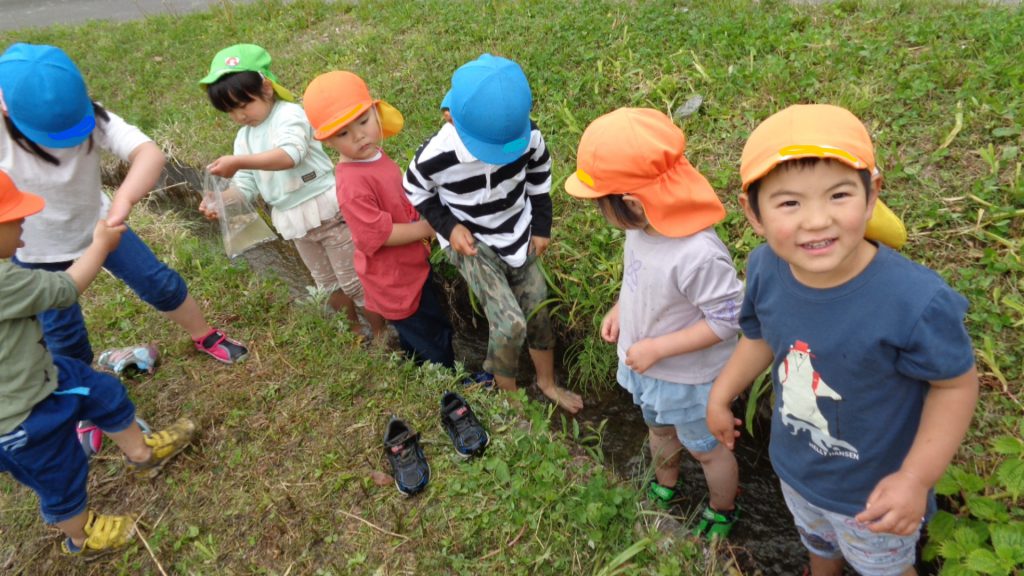 たくさん捕まえたけれど、お家や園で飼えないいもりは田んぼに返しました。そして、保育園に到着です。水槽に移し、石を入れてあげ、「エサはおたまじゃくしを食べるんだよ」とおたまじゃくしを水槽へ、飼育の仕方も心得ている子どもたちです。大切に育てようね。