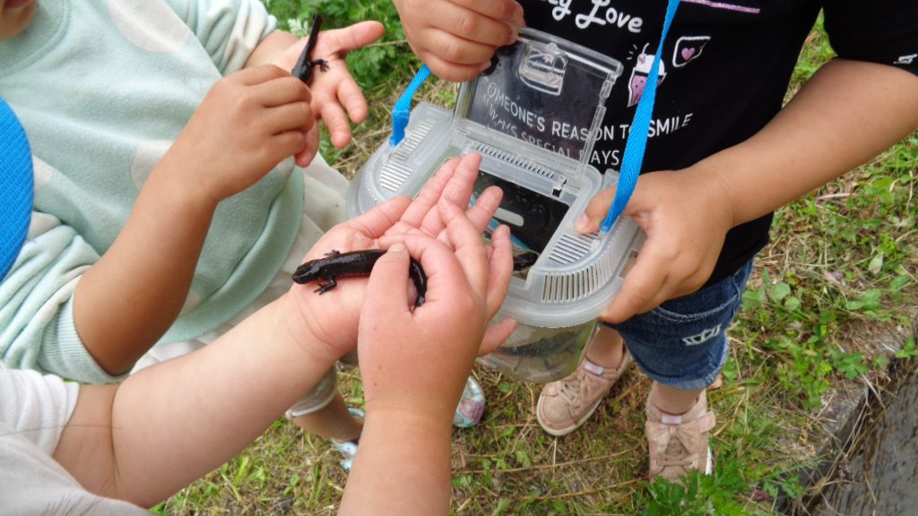 「可愛いね」「名前付けてあげようよ」「女の子かな、男の子かな?」触れ合いながらじっくりと観察会。生き物って魅力的で不思議だね。