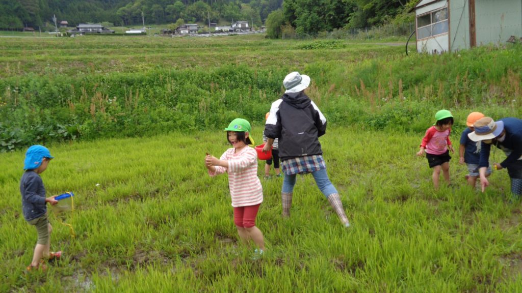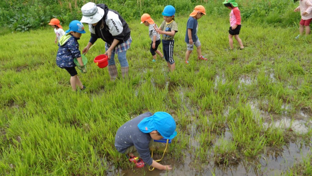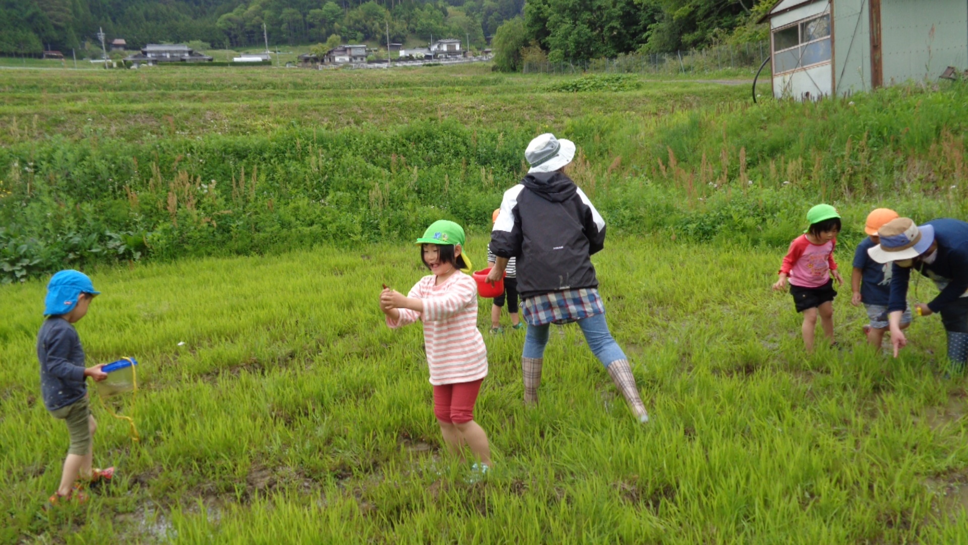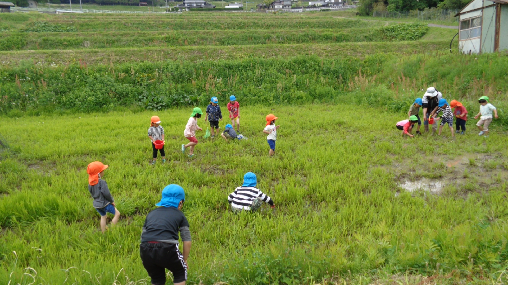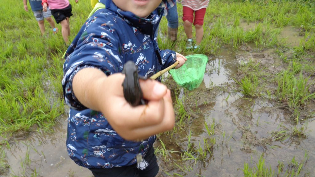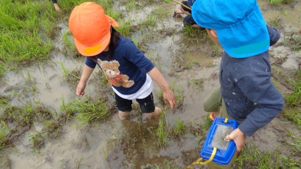 水路や田んぼでいもりを見かけるようになりました。子どもたちから「いもりを見つけに行きたい。」「いもり飼いたいね。」の声が聞かれ、近くの田んぼにイモリを見つけに出かけました。お米は作っていない、天然セリが生えている少しぬかるんだ田んぼです。