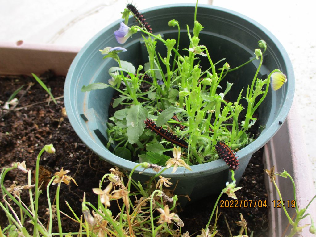 保育園のプランターのパンジーに幼虫さんがウヨウヨ・・・