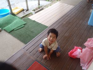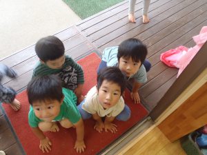 「雨の音でも聞いてみようか!」と話しかけると、 子ども達が一斉に外へ出ました。 天気に関係なく、子どもは本当に外が好きですね(笑)