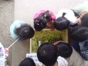 隣のクラスにあったおたまじゃくし、プール掃除の際、年長さんから戴いたものです。「あっ!あしがはえている!」「はやく、かえるにならないかな?」
