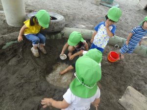 みんなで掘ったり、水を入れ、協力して作ろうね