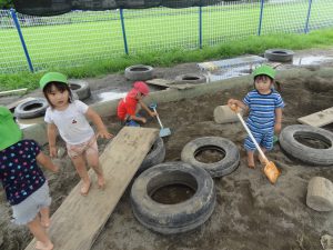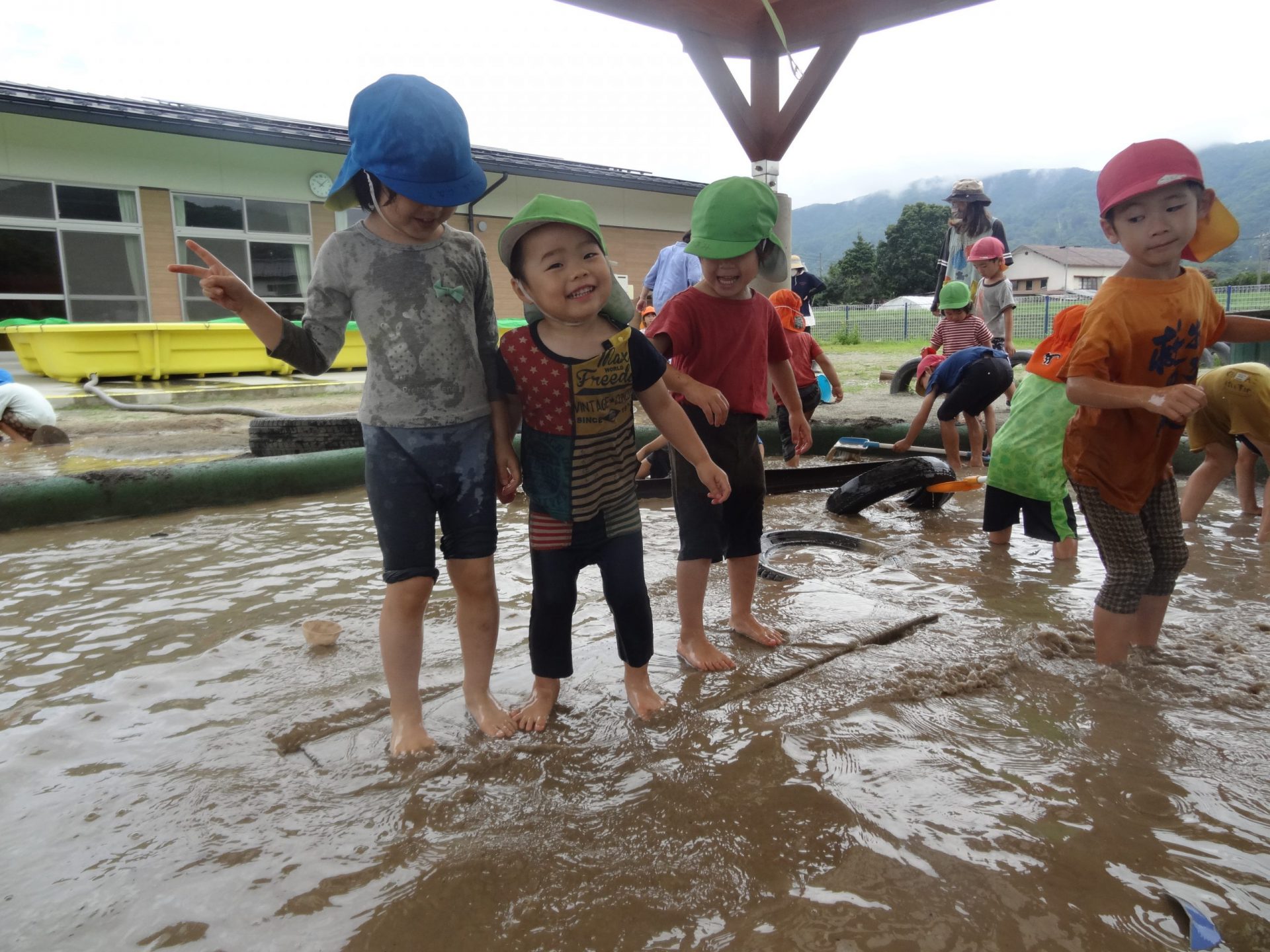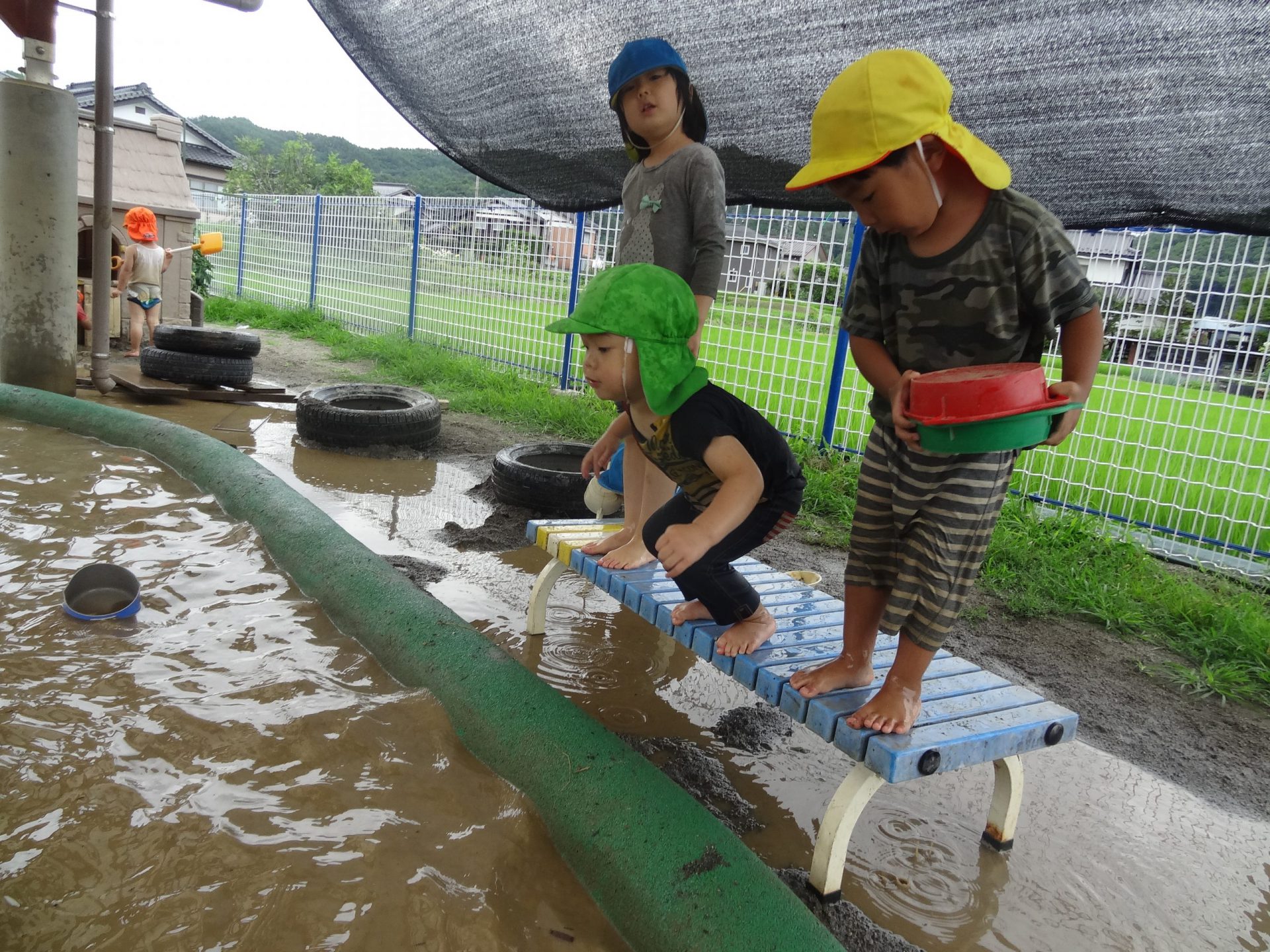 今日は水を入れてユラユラ橋ができました。みんなドロドロになって遊びました。