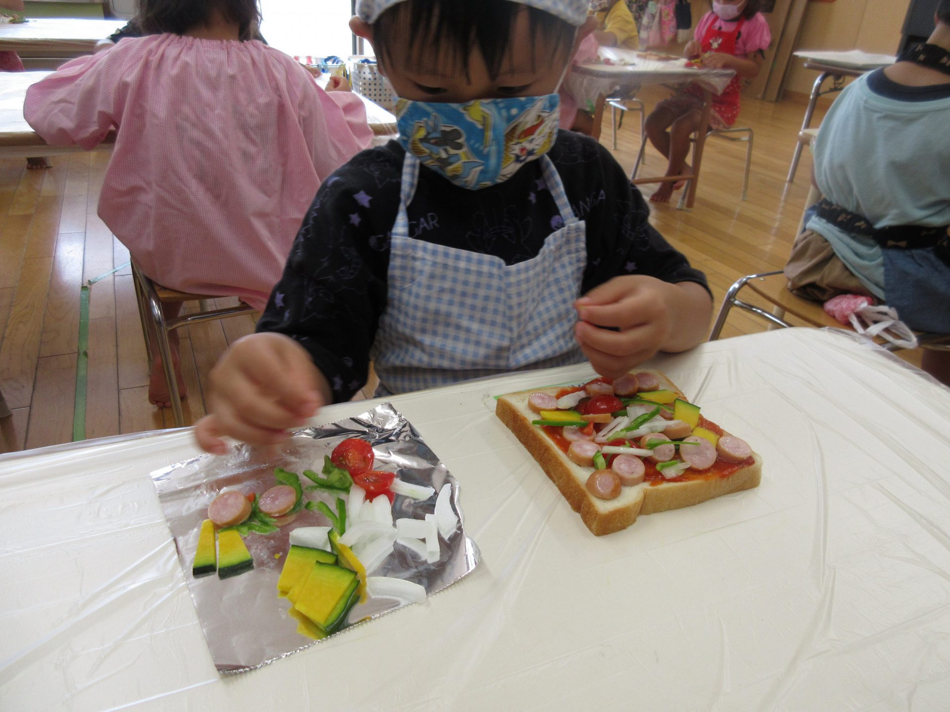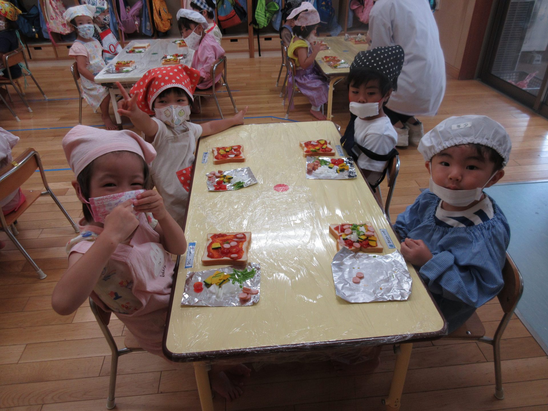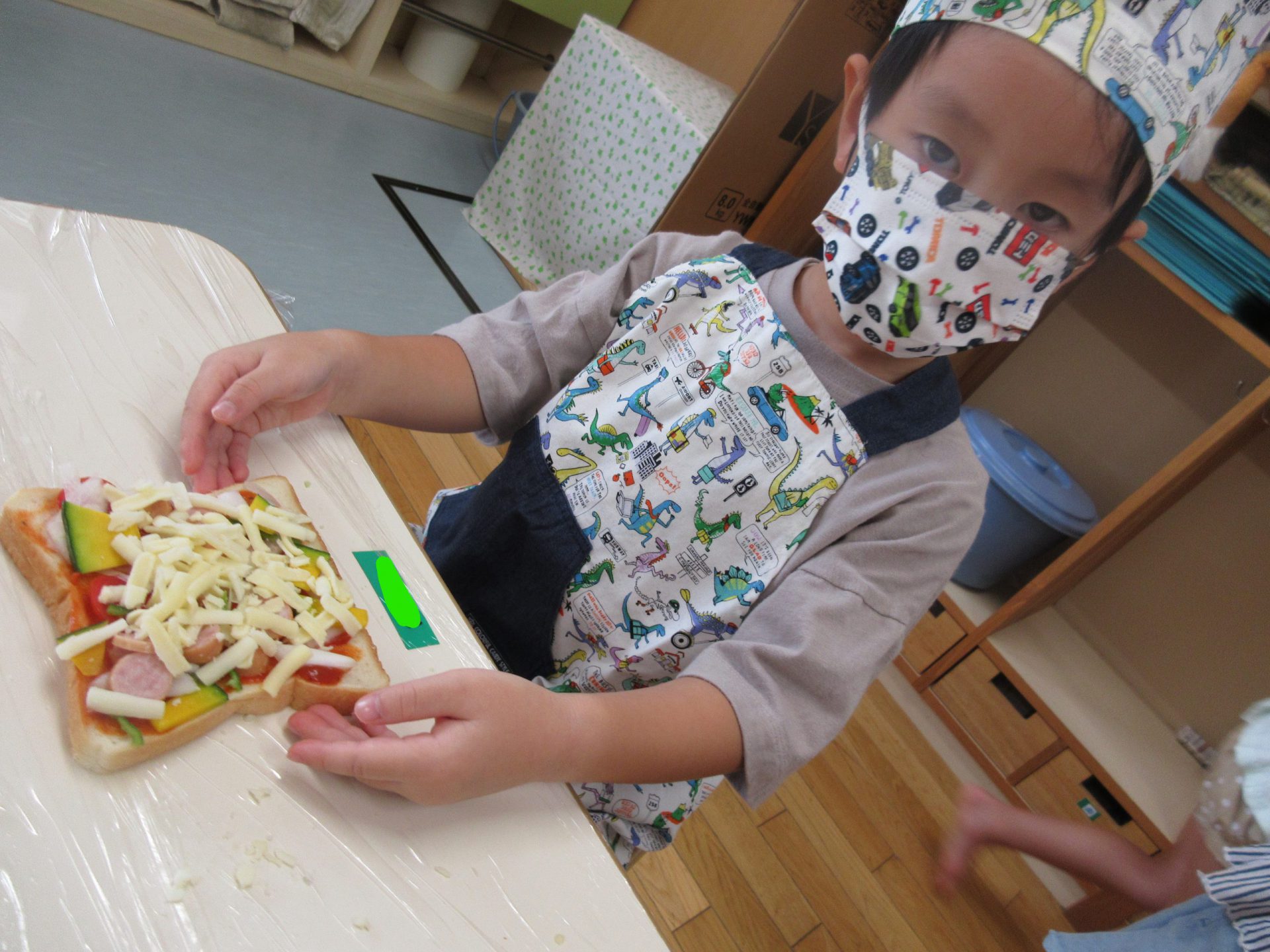 年少さんは、初クッキング。 憧れのエプロンをつけてトッピング 。嫌いな野菜はひとつだけ😊 机に並んだみんなのピザをみたK君が「こーんなにあって、お店みたい!」「ほんとにそうだね」