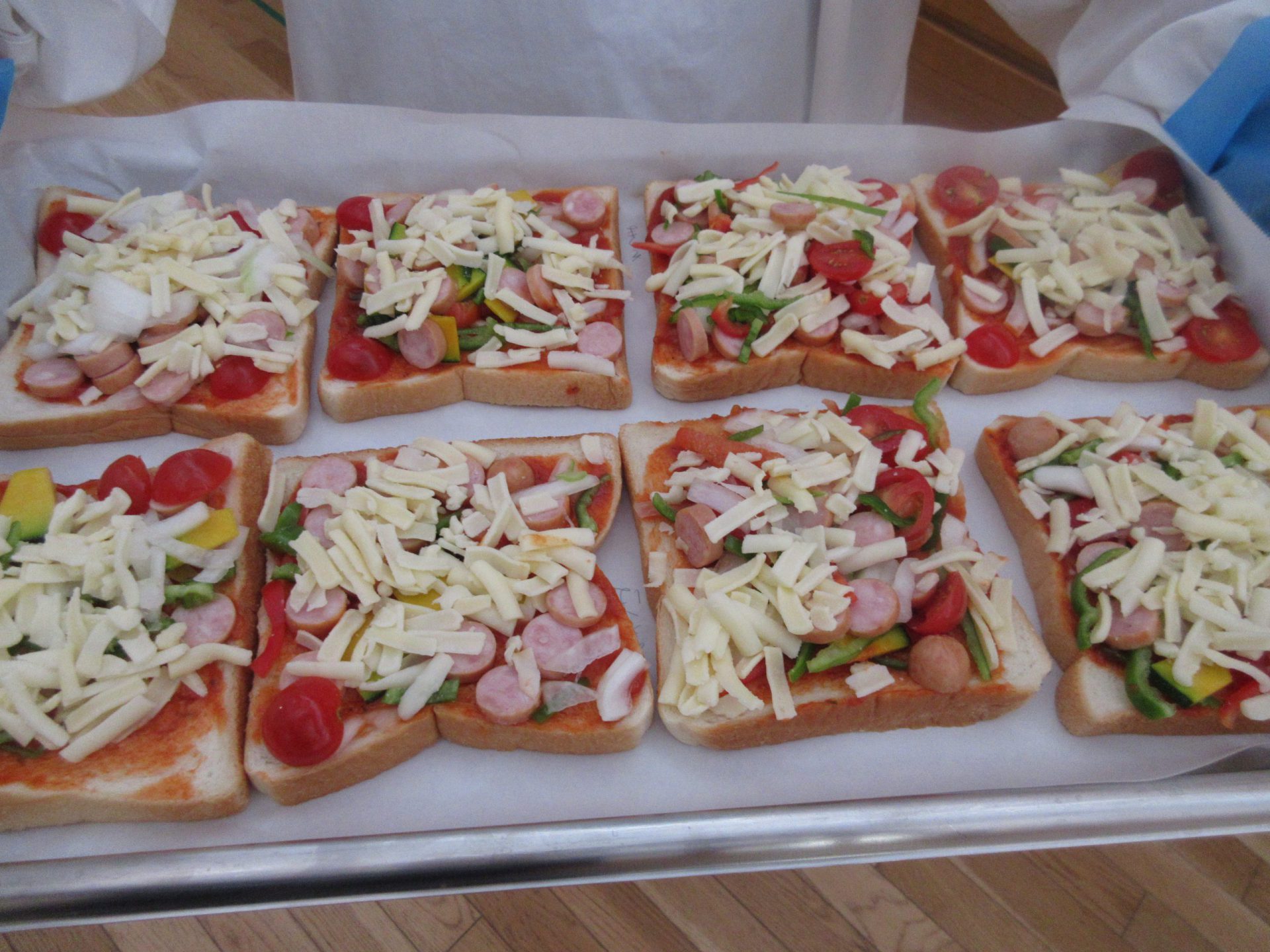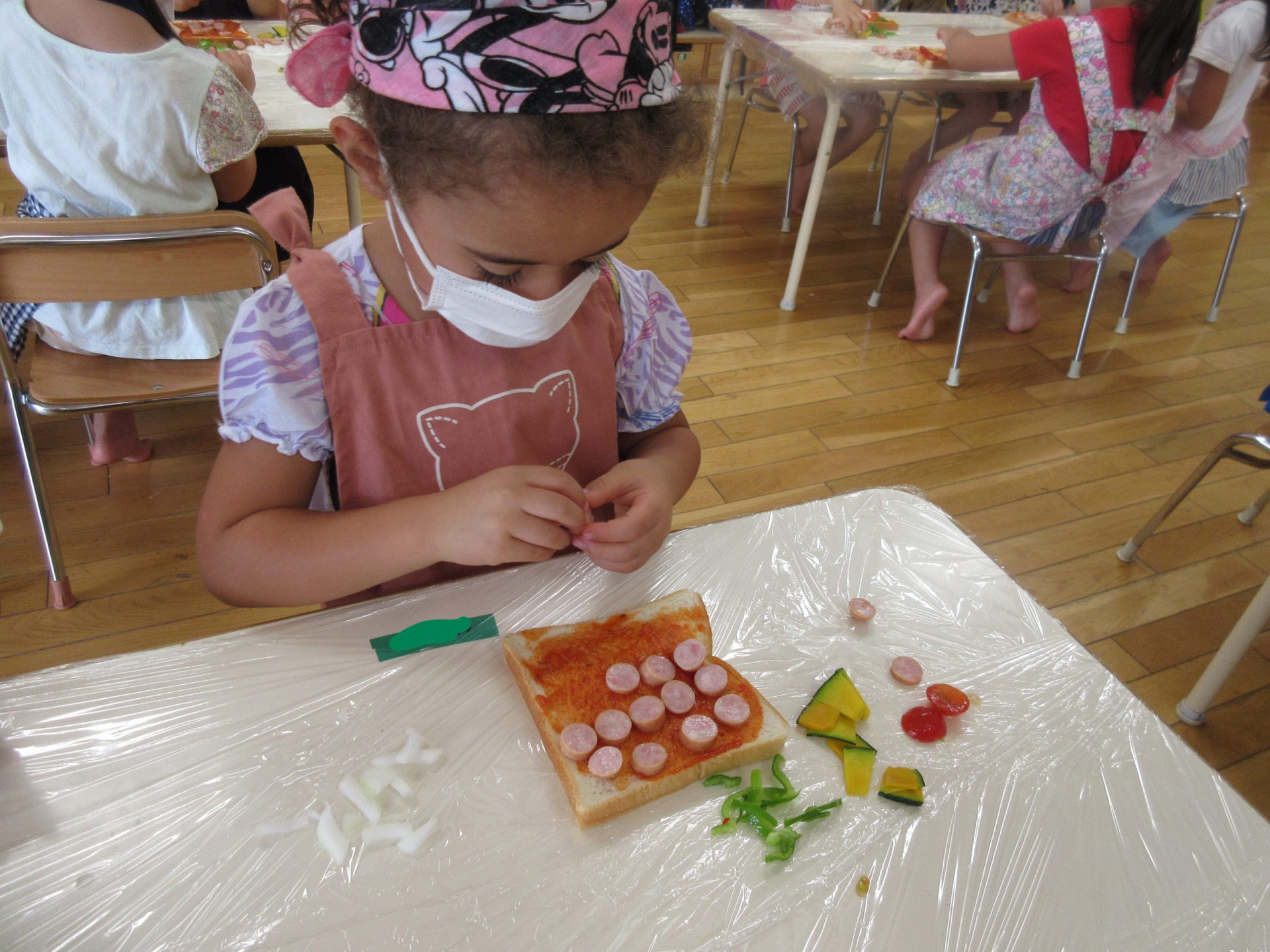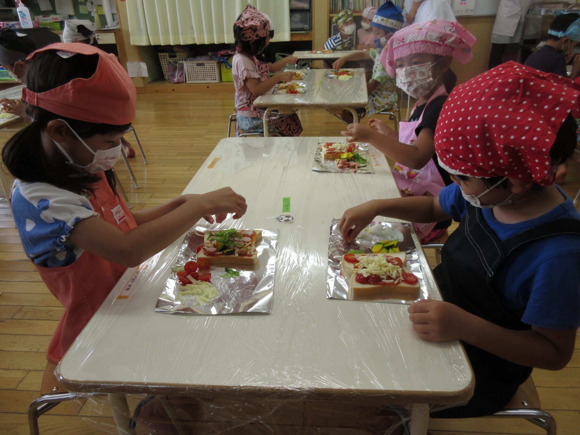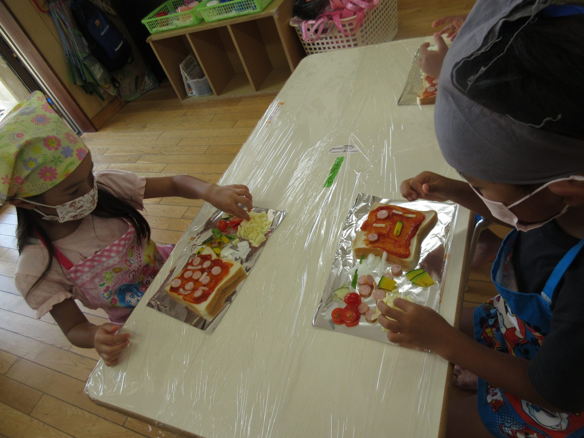 年少さんは、初クッキング。 憧れのエプロンをつけてトッピング 。嫌いな野菜はひとつだけ😊 机に並んだみんなのピザをみたK君が「こーんなにあって、お店みたい!」「ほんとにそうだね」