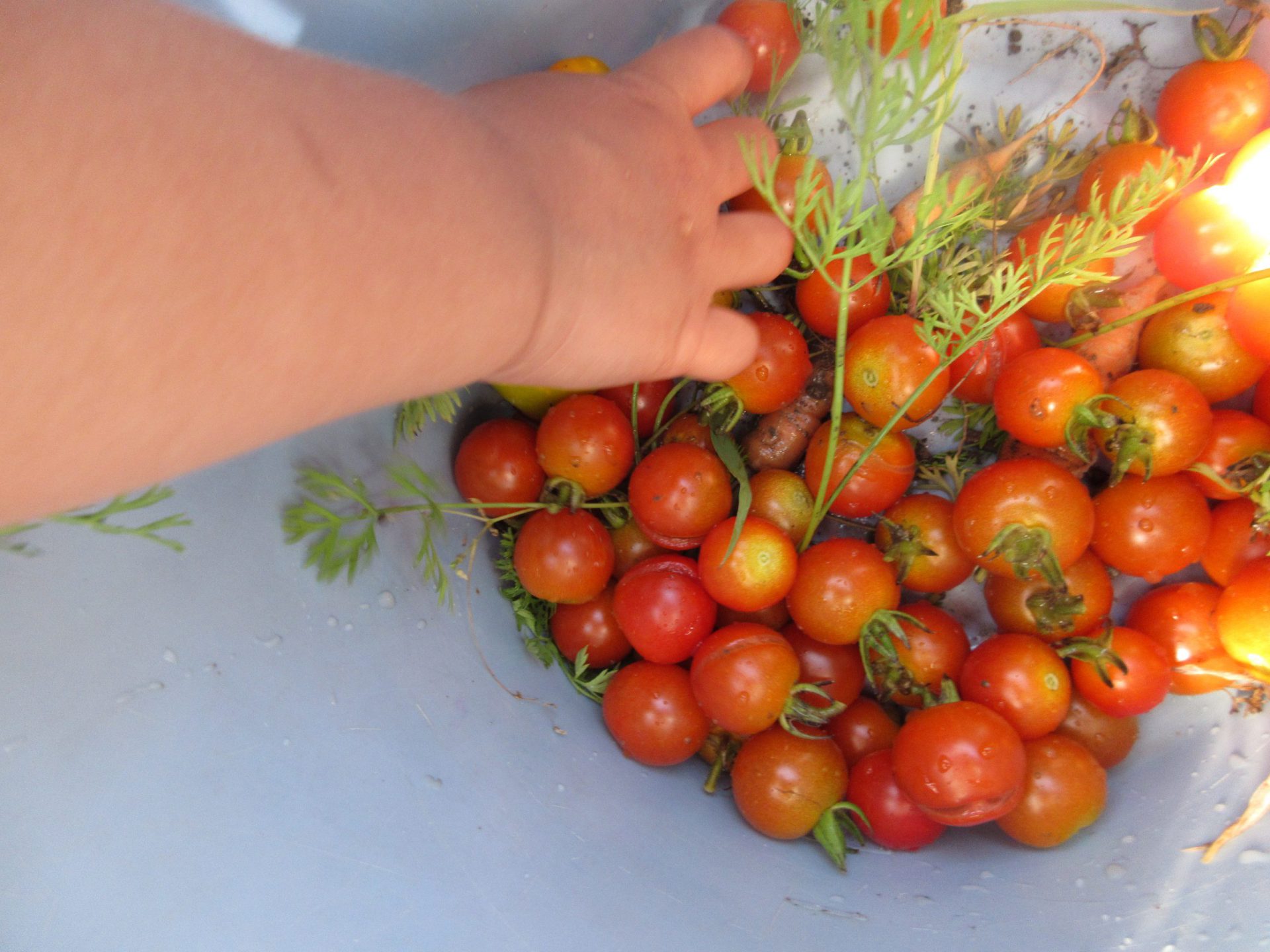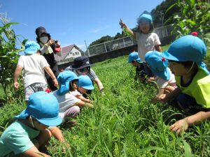 畑は保育園の前にあるので、年少さんも、収穫できます。雑草の中からニンジンを抜いてみます!「あった!」「ちっちゃい!」