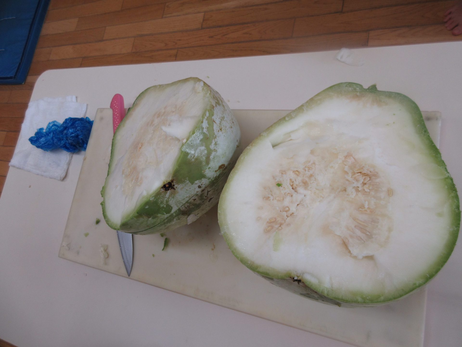 おまけのお話。春に植えたメロンを「いざ食べようと切ったところ、 あれ?何か違う」匂いはユウガオ 。皮が固く、男性保育士がやっとの思いで切るほど。実を切って食べるとやっぱりユウガオの味。