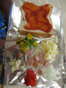 ピザの残りの具はスープの中へ 「今日は最高!どっちにもウインナーがはいってるに!」