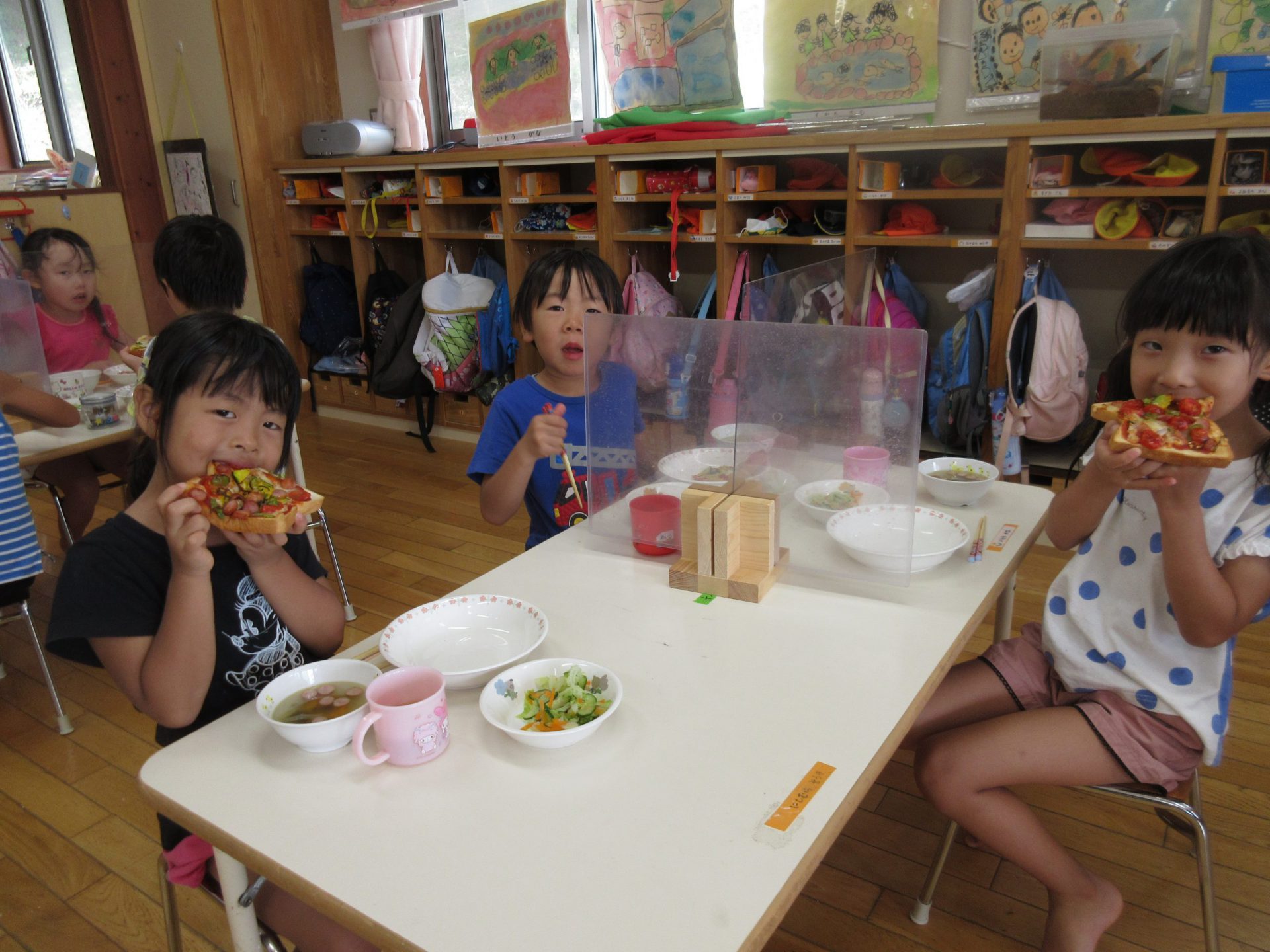 チーズ増し増しで作ったピザは「カリカリで、すっごくおいしいよ!」 コロナウイルス感染対応をしながらですが、ピザのトッピングを体験できたね。畑の野菜おいしかったね。