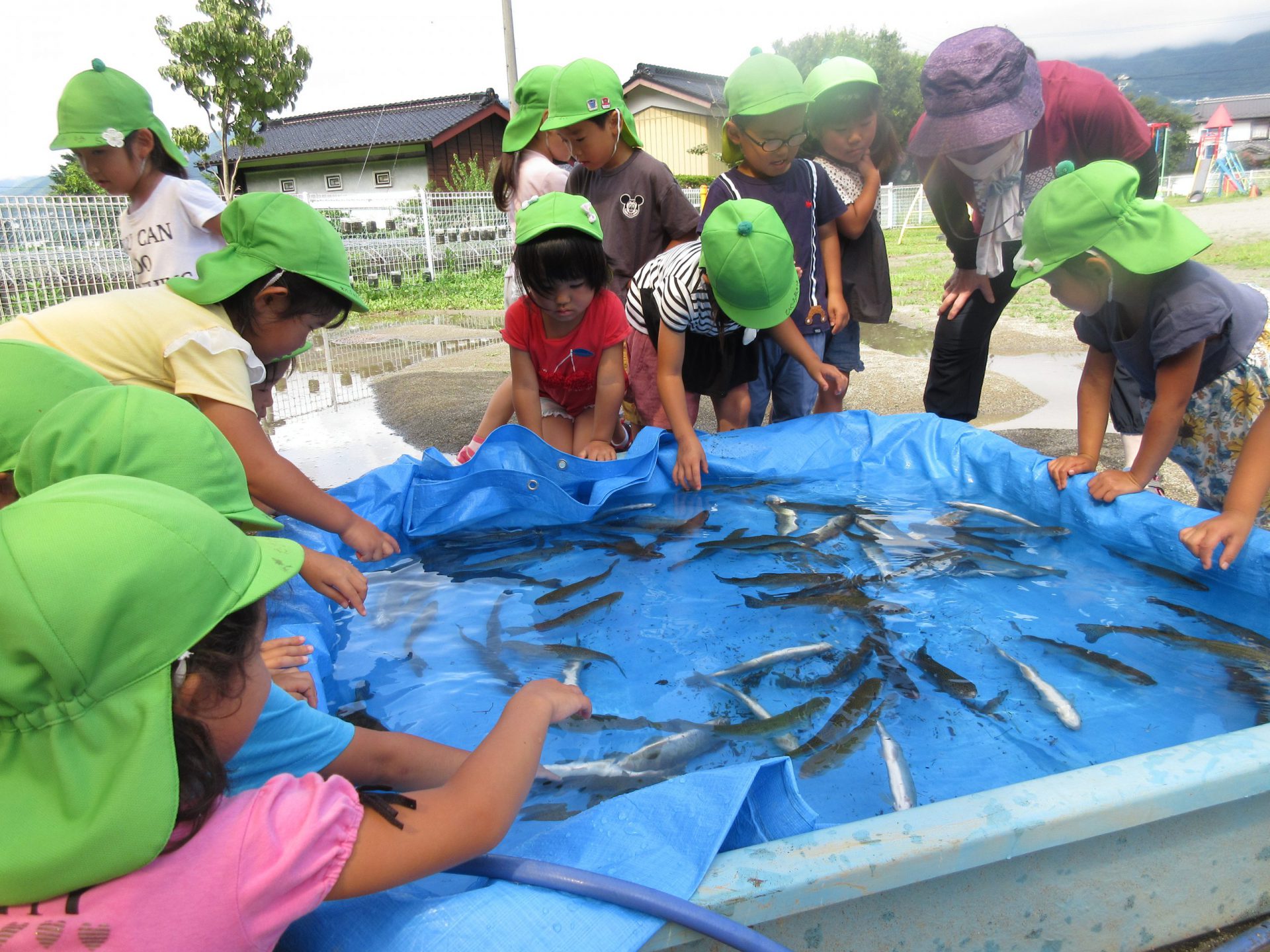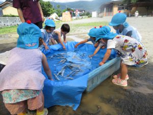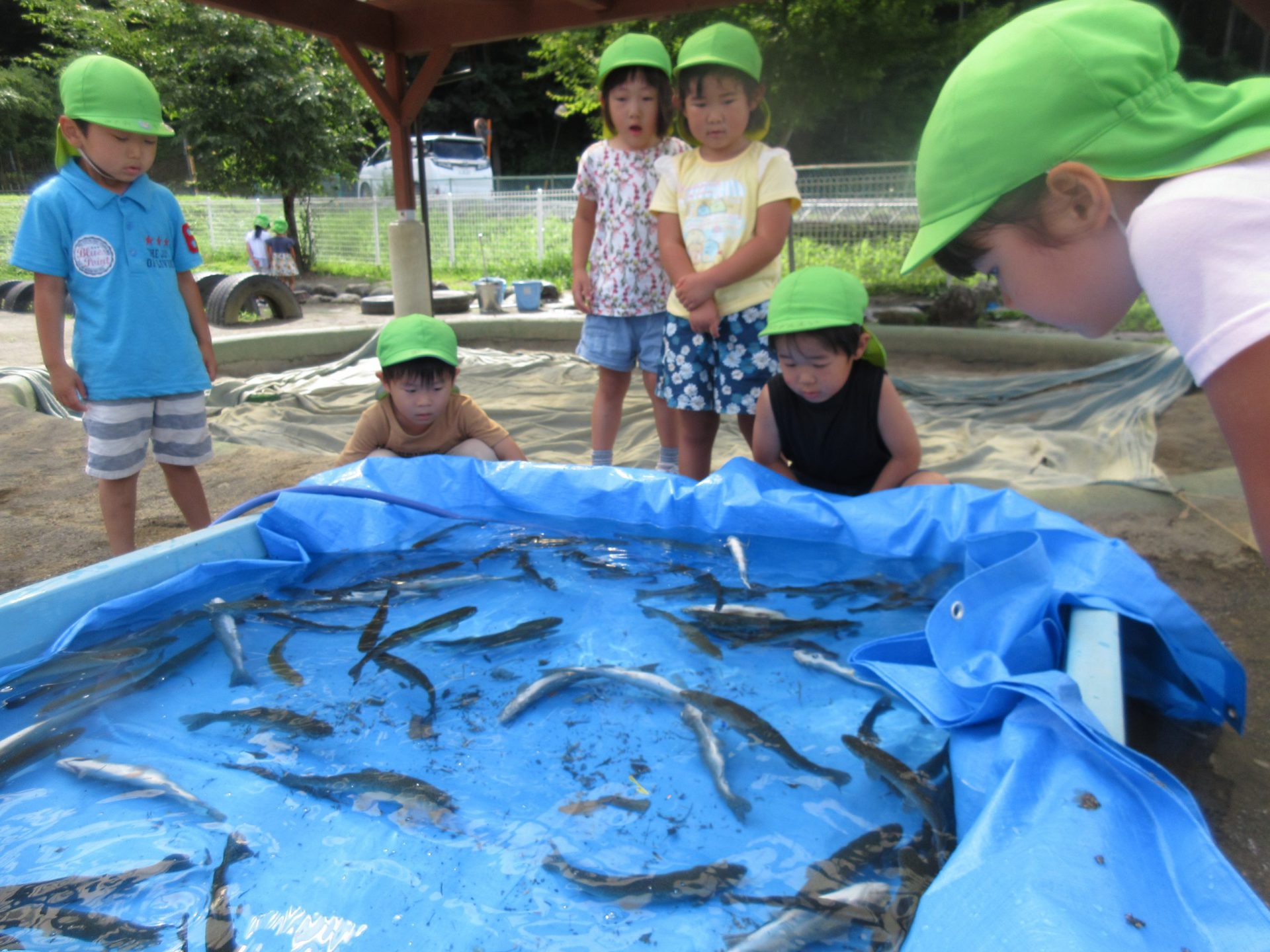 7月 年長さんの魚つかみの日 園庭に活きの良いニジマスが届きました。興味津々の年中さん