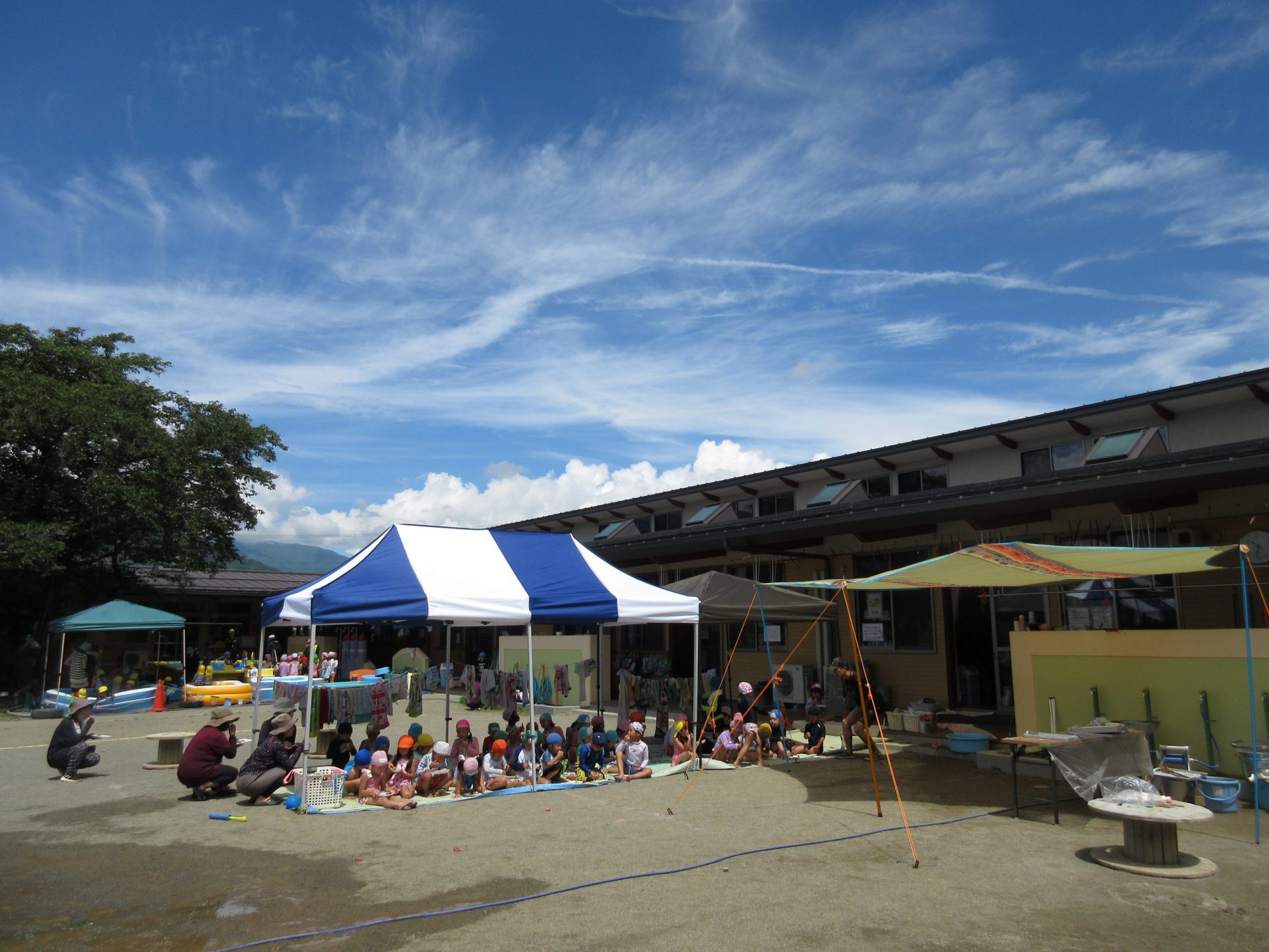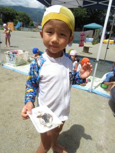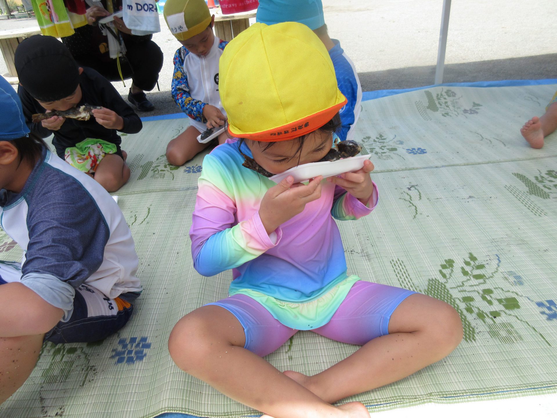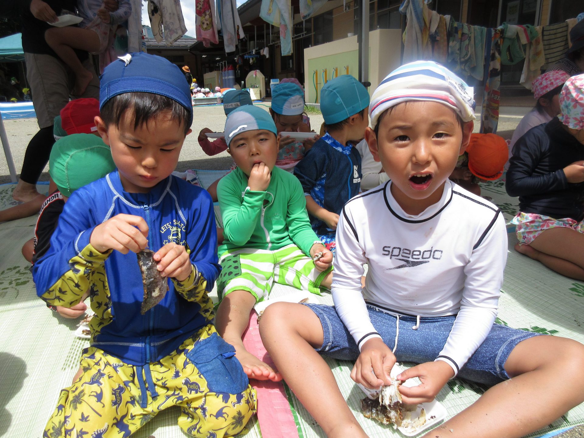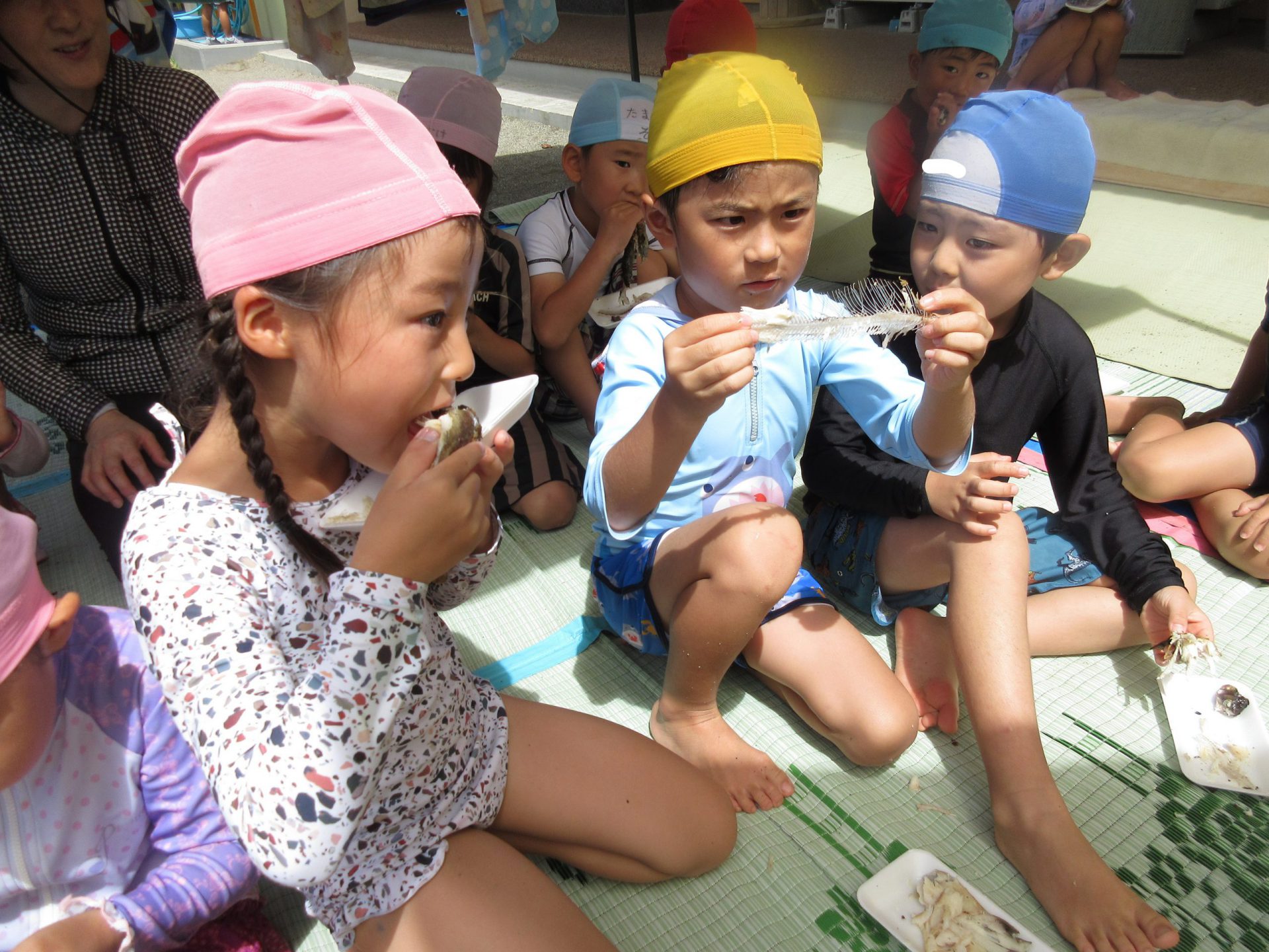 最後は外でカレーを食べたよ 。最高の魚つかみでした! 本来ならば、年長さんは長谷へ行って川遊びを経験するのですが、 ここ数年はコロナウイルスや災害の影響で川遊びができない状況です。早く川遊びができるようになるといいなあと願いながらも、他の学年の皆も、魚の味見ができて、よかったね。