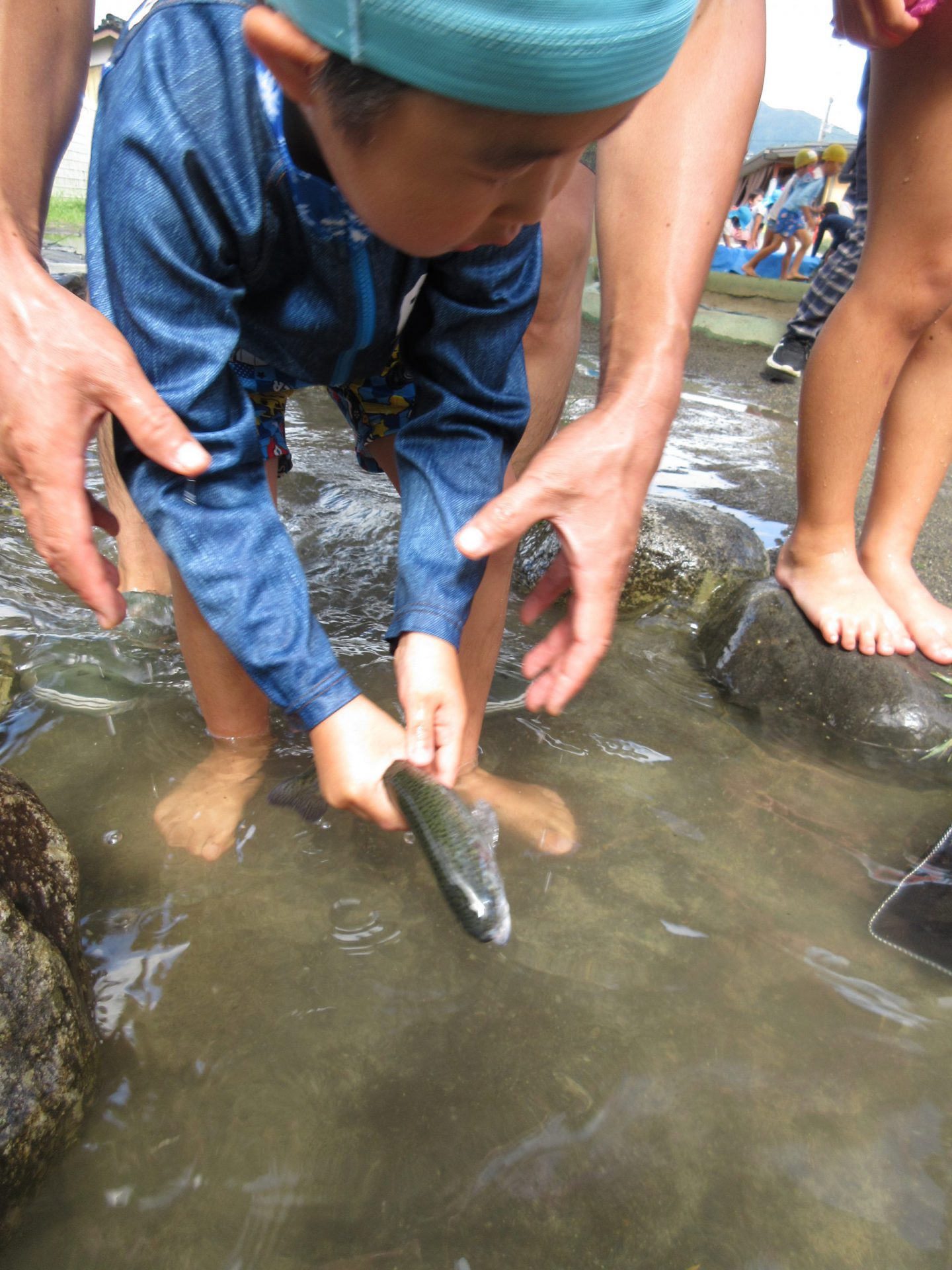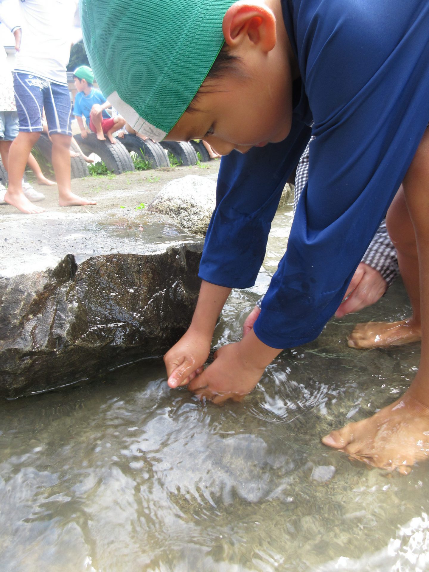 いよいよ年長さんの出番です!! せせらぎへ放します。すばしっこくてなかなか捕まらない!はじっこへ追い詰めて… よっしゃ!!