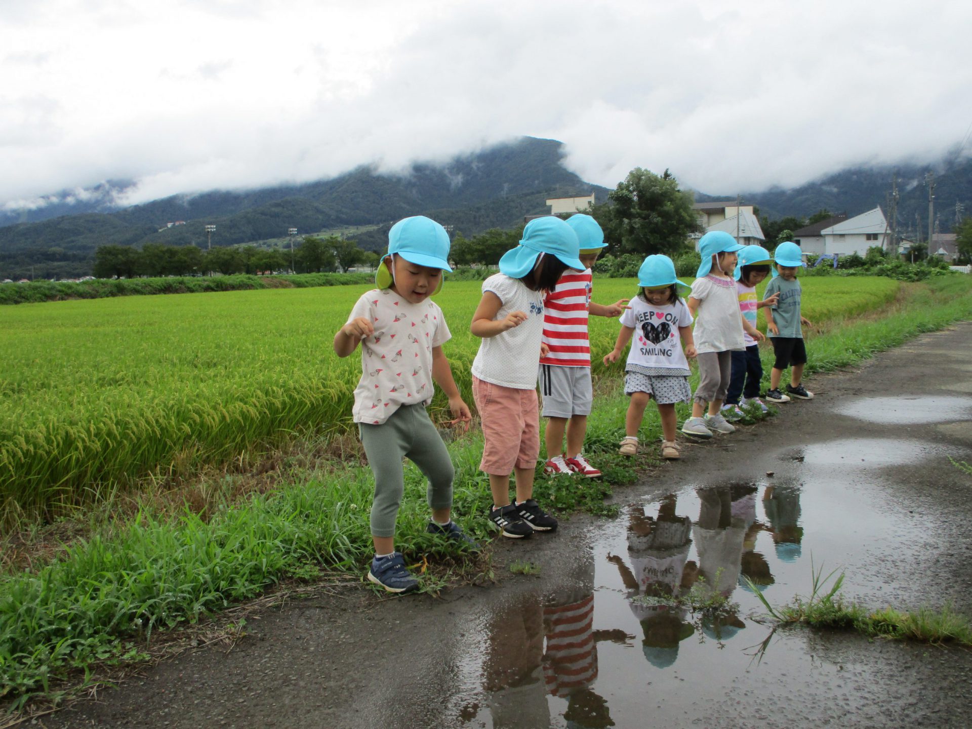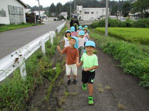 帰りは小雨が降る中・・・ 「てるてるぼうずのうた うたおう!」と みんなで元気に歌を口ずさみ、猫じゃらしを手に保育園に戻りました。