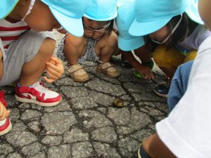 外に出ると、玄関先の木の葉が黄色く色づき始め、落ちている葉もあります。 「木の下に葉っぱが落ちているよ」「ほんとだぁ」「なんでかなぁ?」「かぜも すずしいね」「むしのこえ きこえる」「あきかなぁ?」と 感じたことを言葉にする子どもたち。