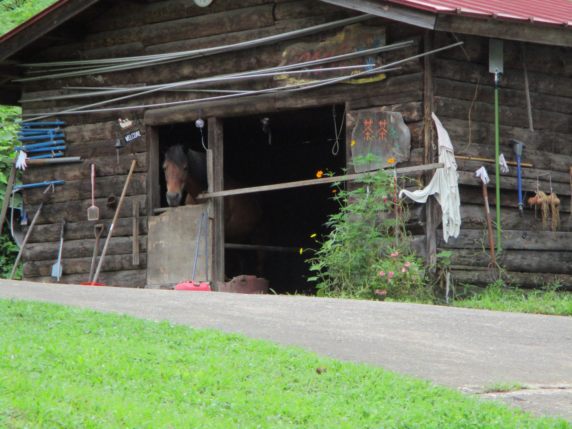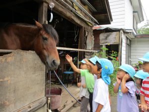 プール遊びが終わり間もなく、「ちゃちゃ どうしてるかな?」「ちゃちゃに あいにいきたい!」と、年少児。 保育士「じゃぁ、久しぶりに茶々に会いにいってみよう!」。 木曽馬の(名前)茶茶を飼われているお宅まで、散歩に出かけることになりました。