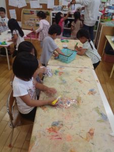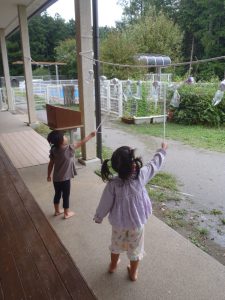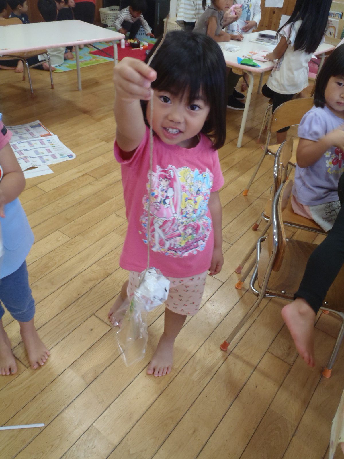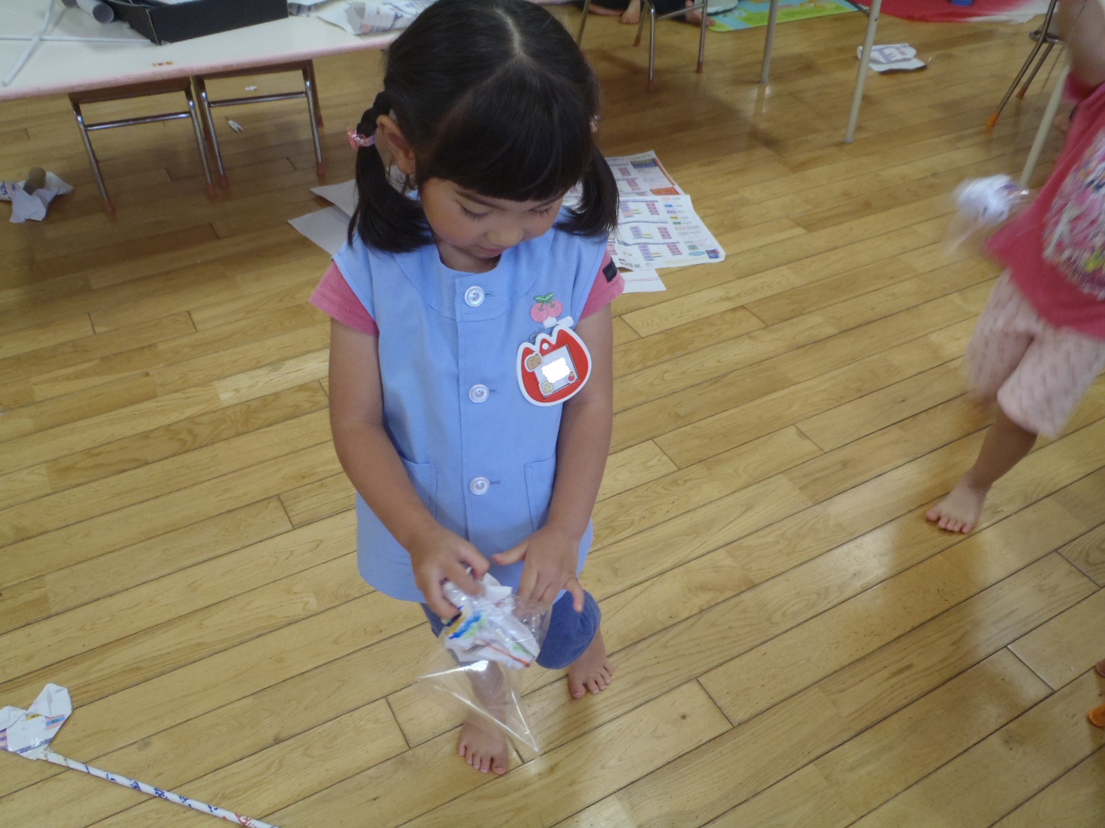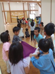 最後はバルーン。カッコいい年長さんがバルーンを高々と上げています。 少中も負けじとミニバルーン(と言っても“風呂敷”ですが(笑))を持って真似しています。憧れの気持ちですね。きっと今の年少年中さんもステキな年長さんになるでしょうね!