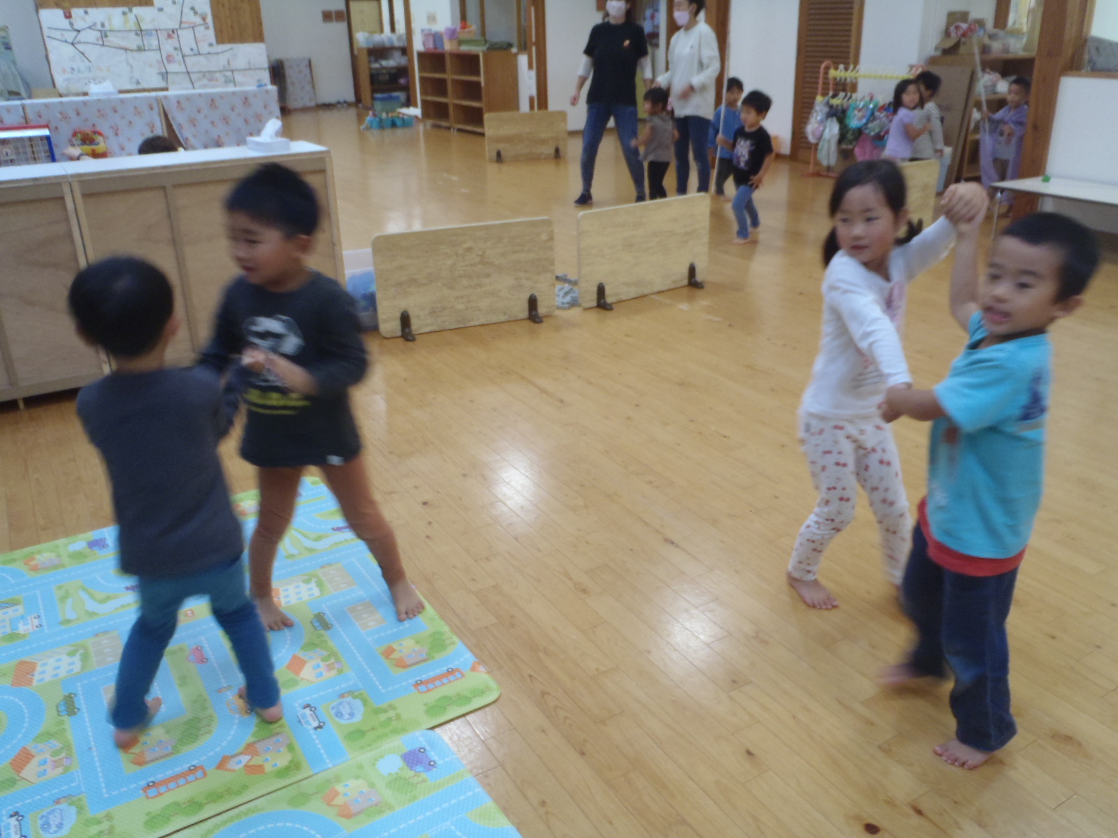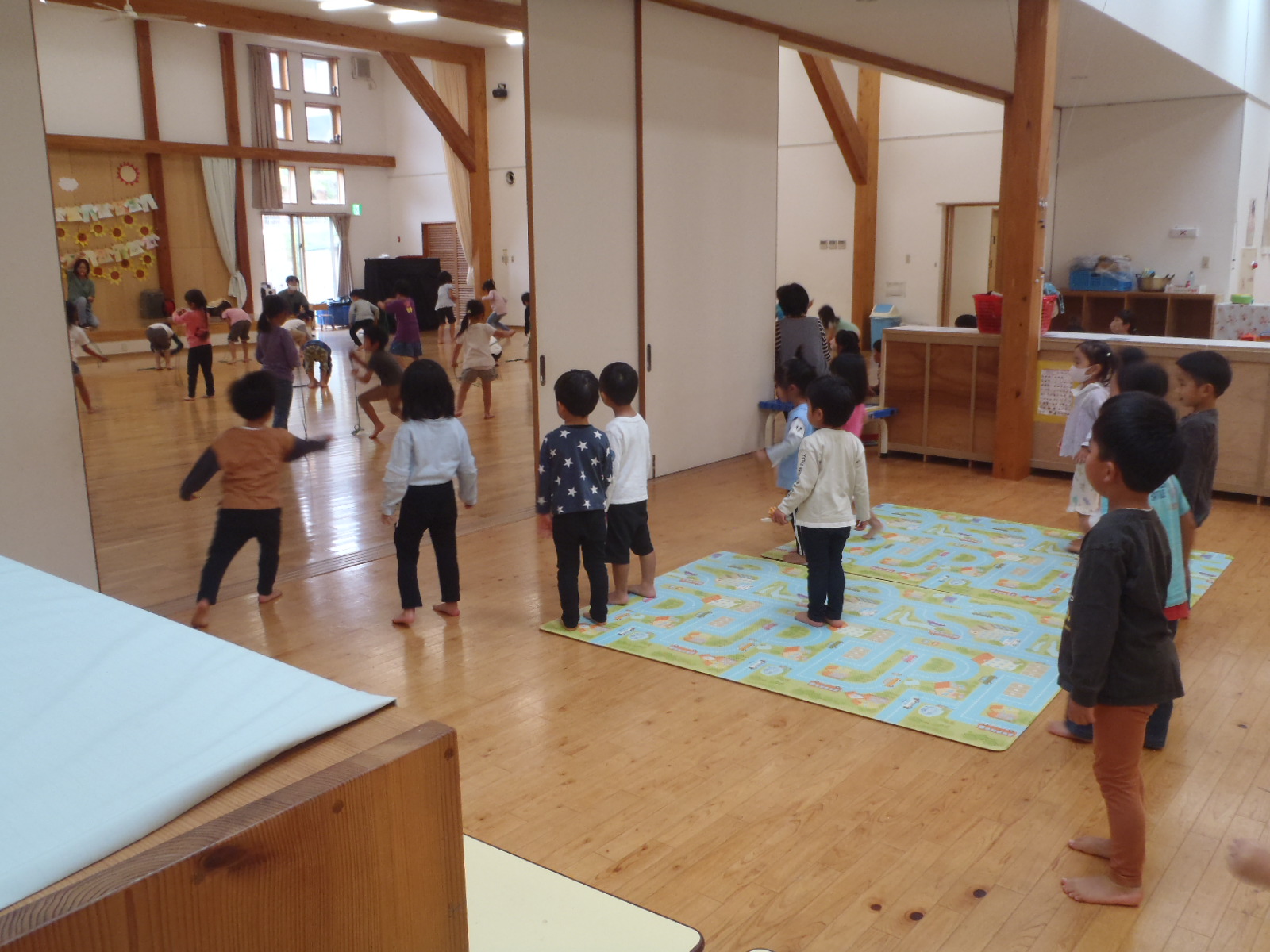 リズム室では年長さんが最後の練習をしていました。音楽が流れ始めると、何だ何だと年少さん年中さん達が集まってきました。
