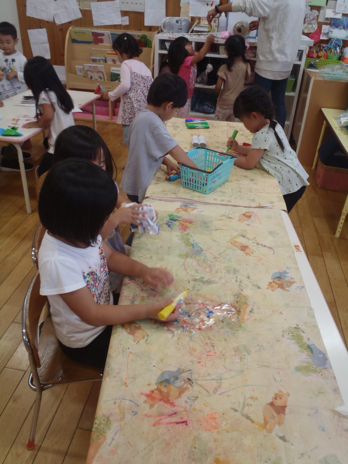 まずは、透明なビニル袋にマジックでお絵描きをします。