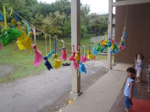 年長さんのてるてる坊主はお花紙で作ってありました。色とりどりで華やかですね!