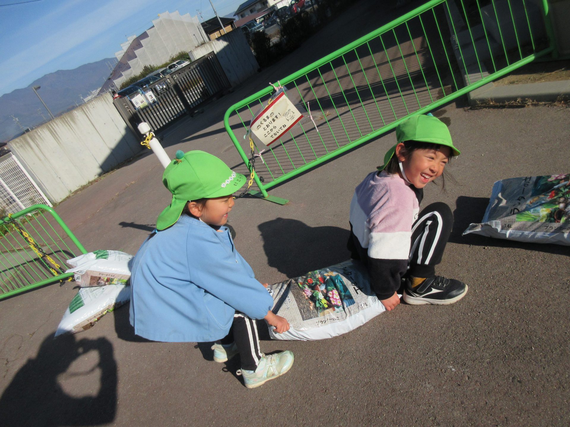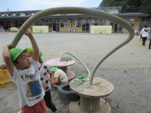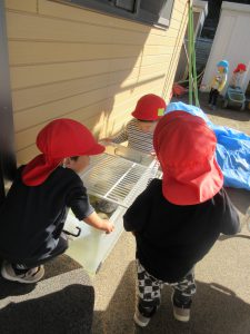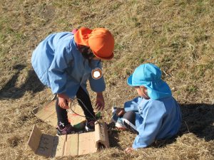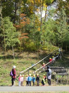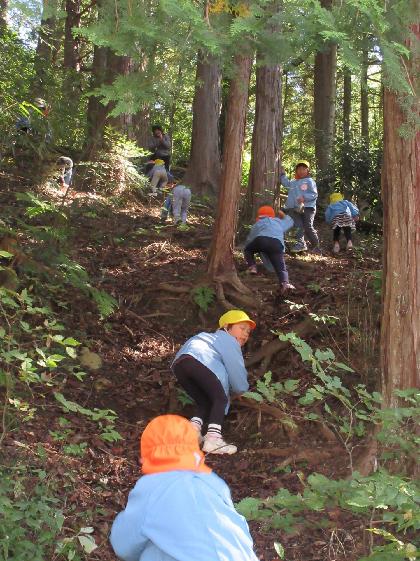 そうそう、働き者の年長さんといえば、ちょっと足を延ばして白山神社へ遠足に行きました!片道50分くらいかかりましたが、よく歩きました!歩いた後の急斜面だって平気平気!上の段へ抜けて虫探しも楽しみましたよ!沢山遊んで、たくさん歩いて…頼もしい年長さんです。