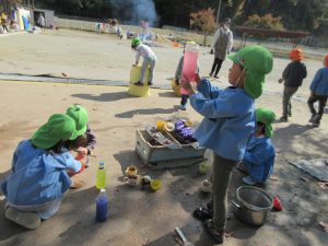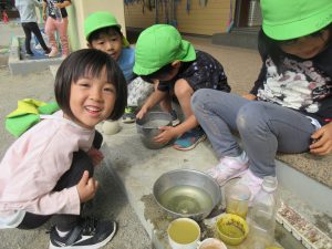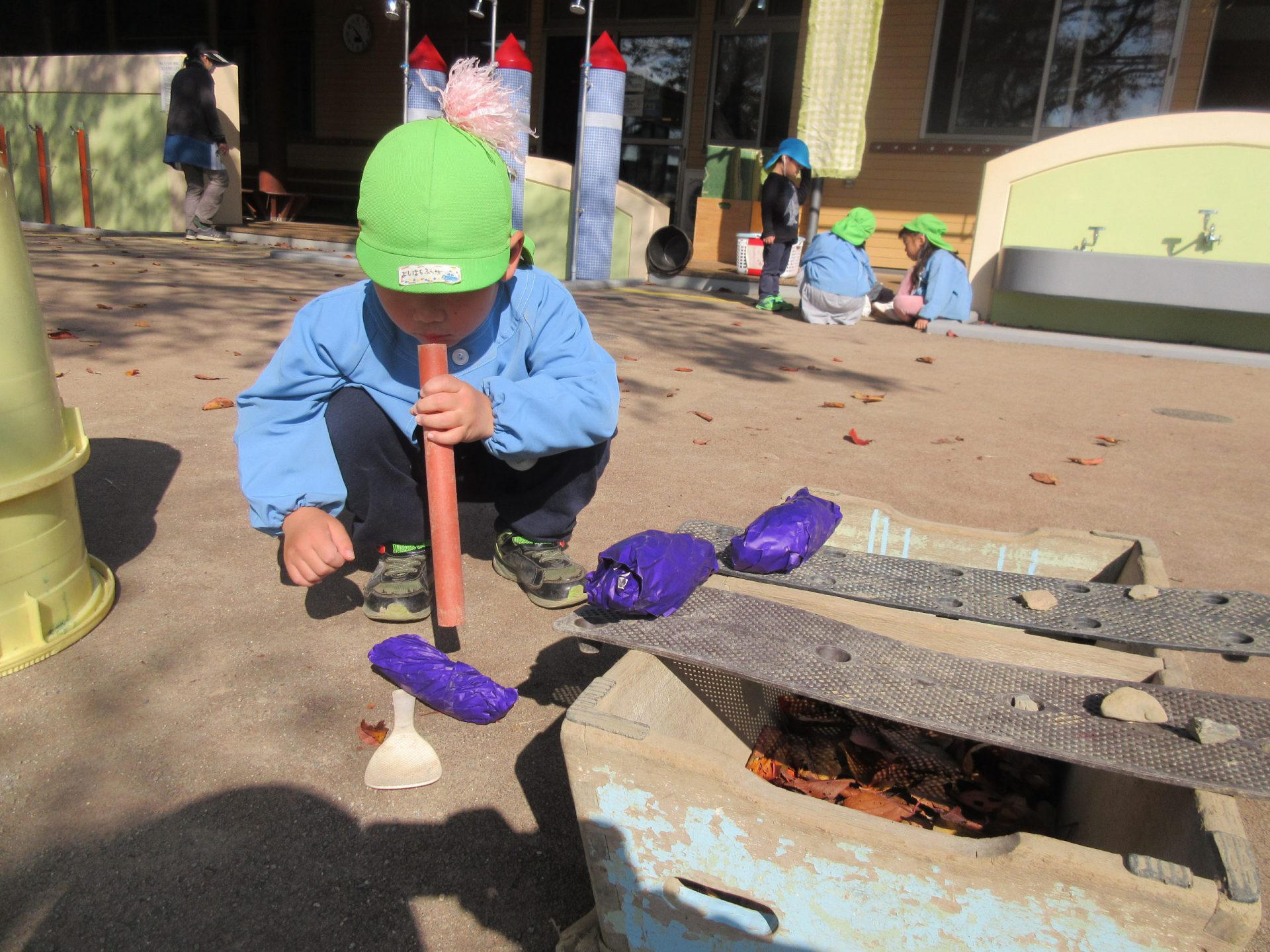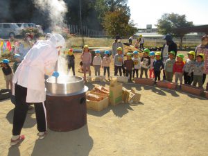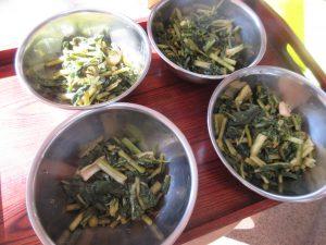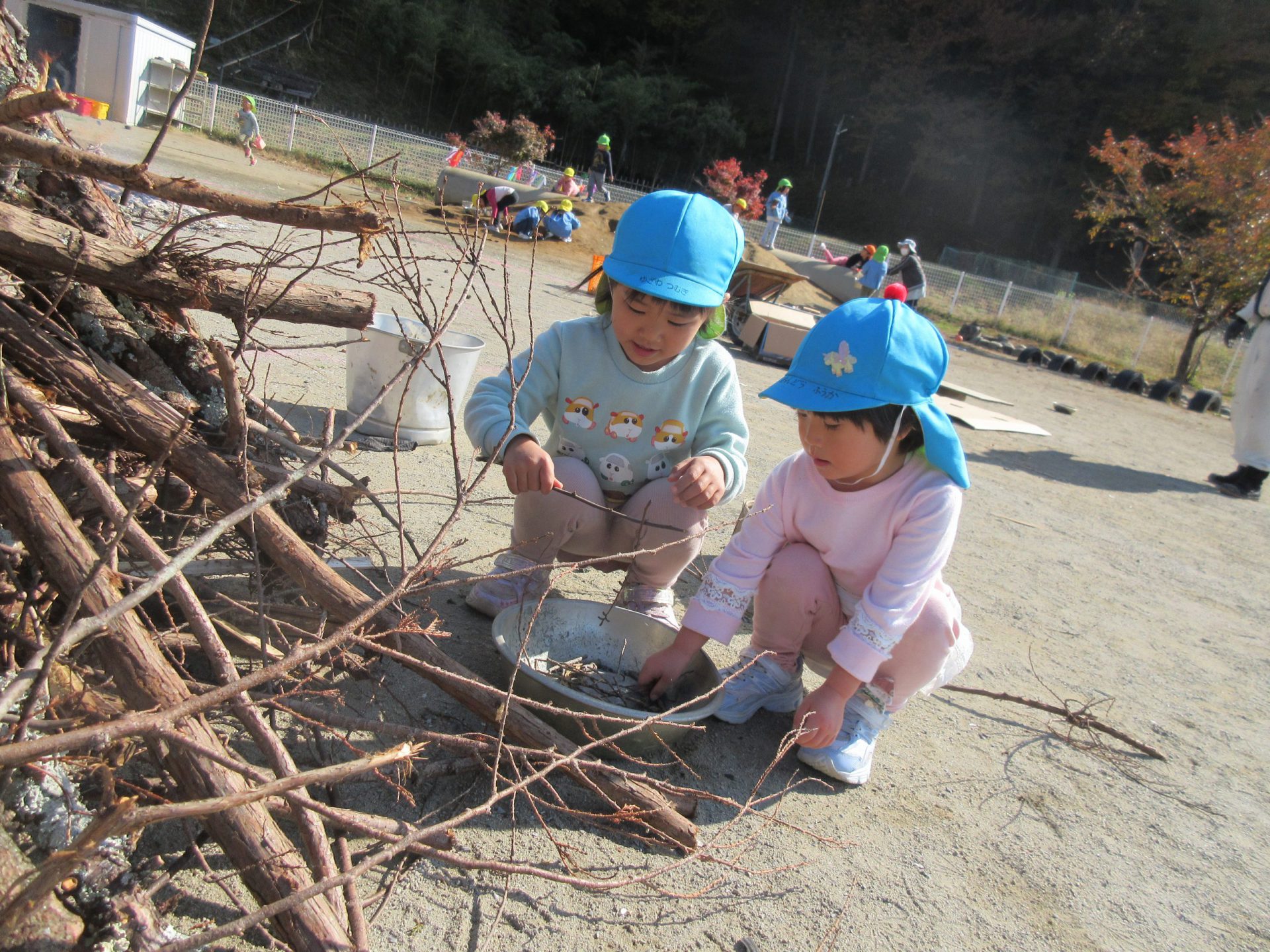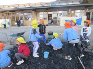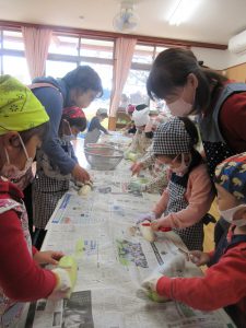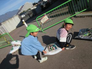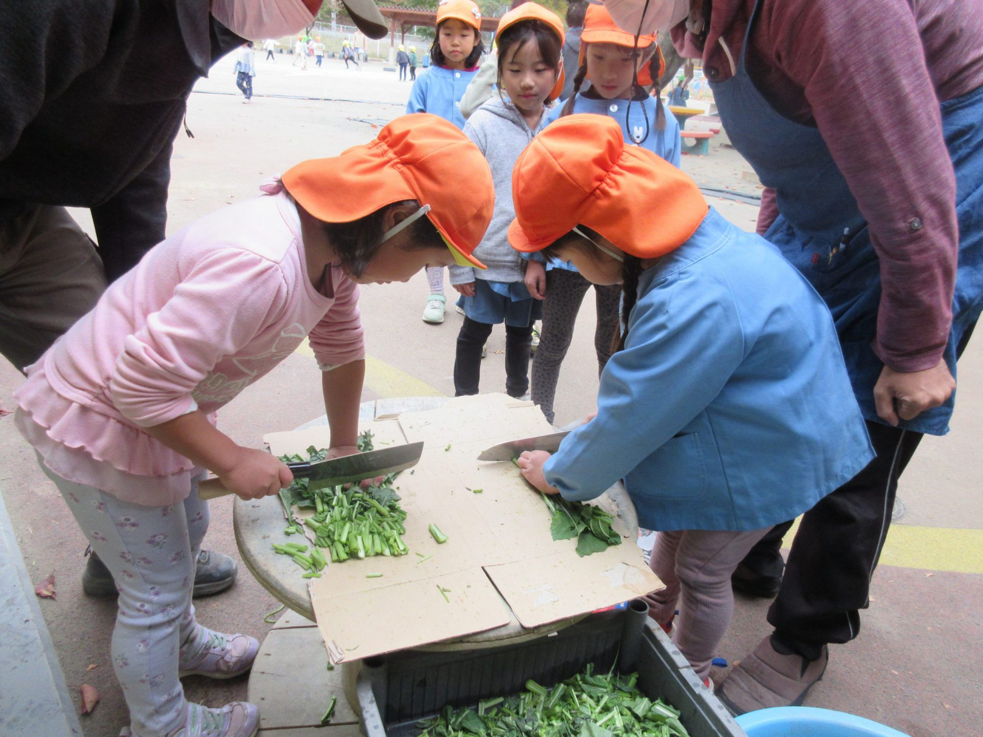 畑には大根と羽広菜も蒔きました。 羽広菜は伊那市西箕輪の郷土野菜です。 この日は羽広菜を切って、お醤油、ザラメ、酢、ニンニク、鷹の爪で切り漬けを作ります。子ども達の手つき、ますます上手!「おばあちゃんと家でやったことあるよ」と話す子も。
