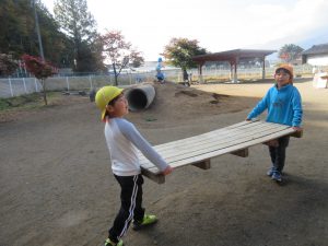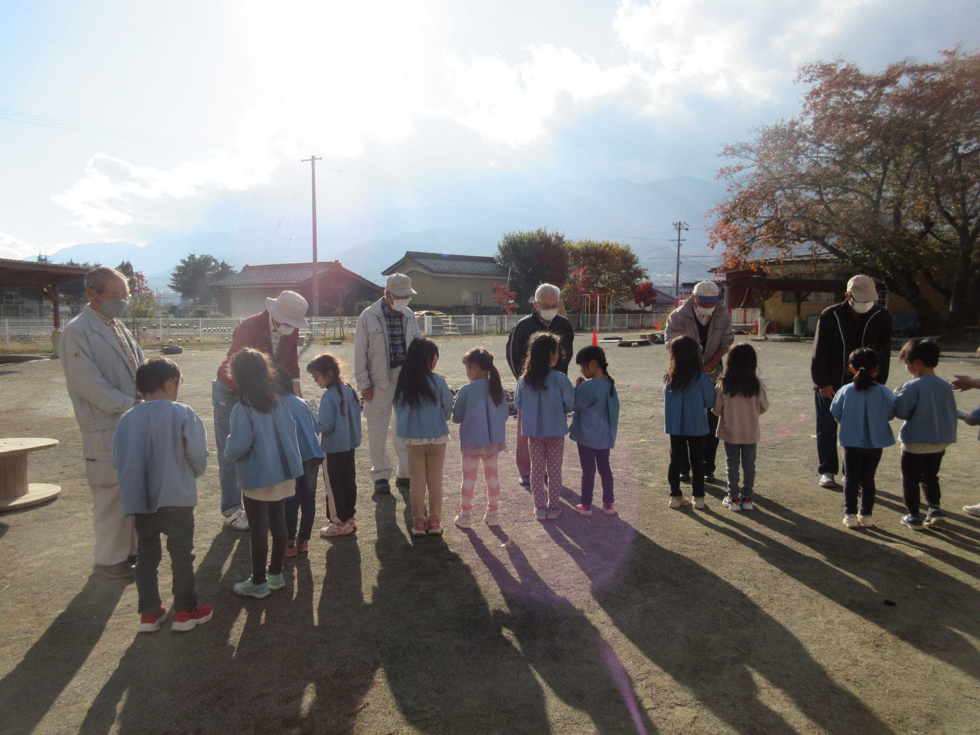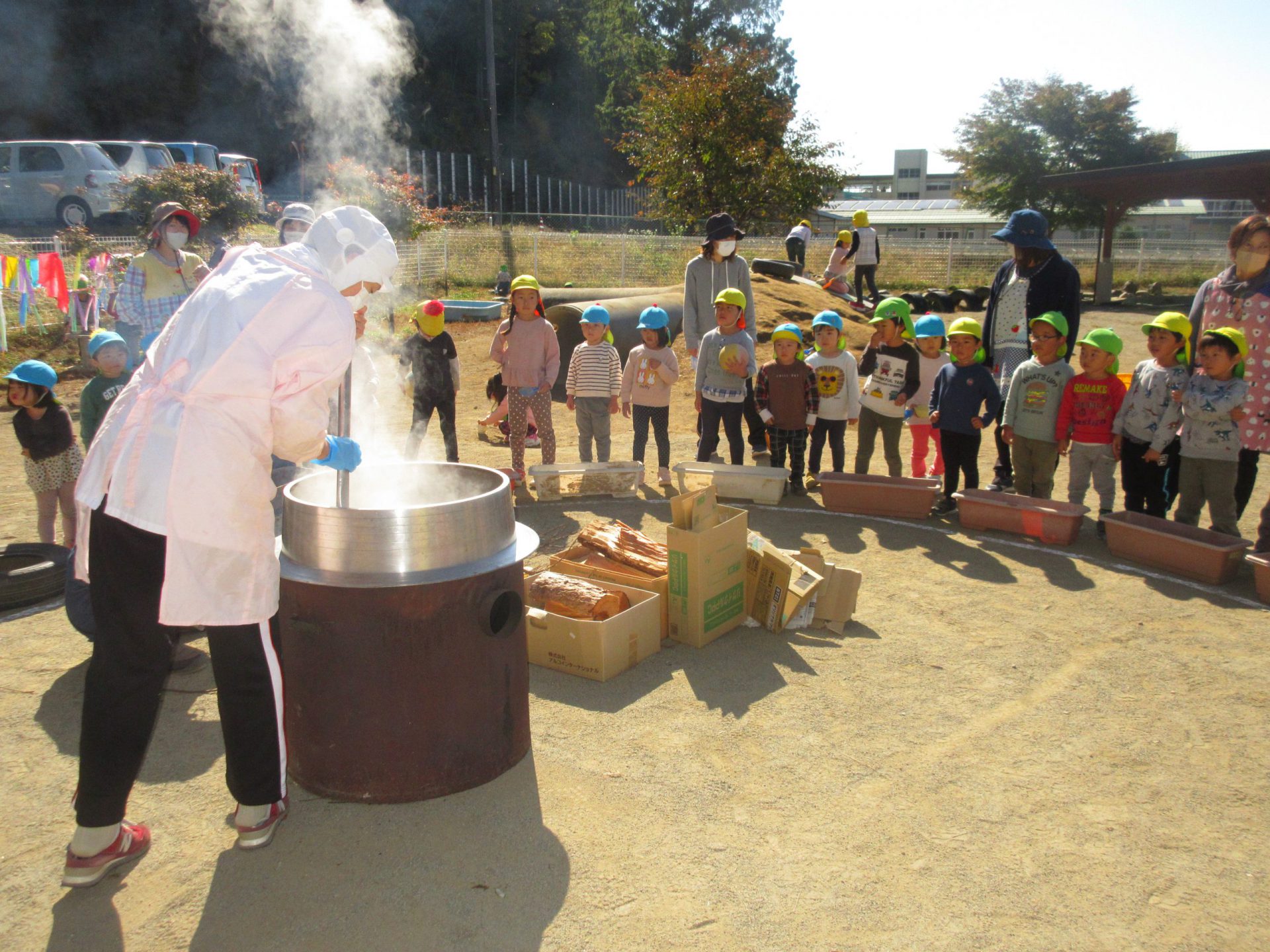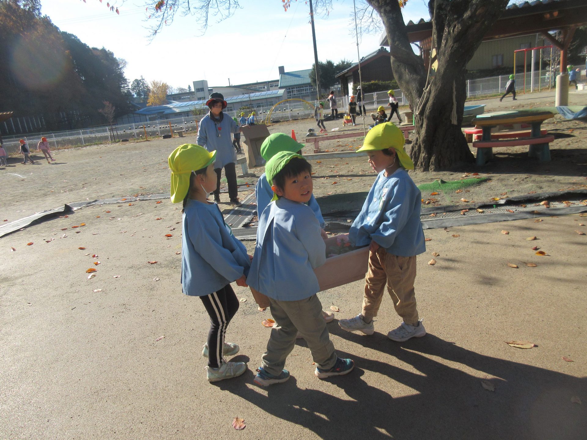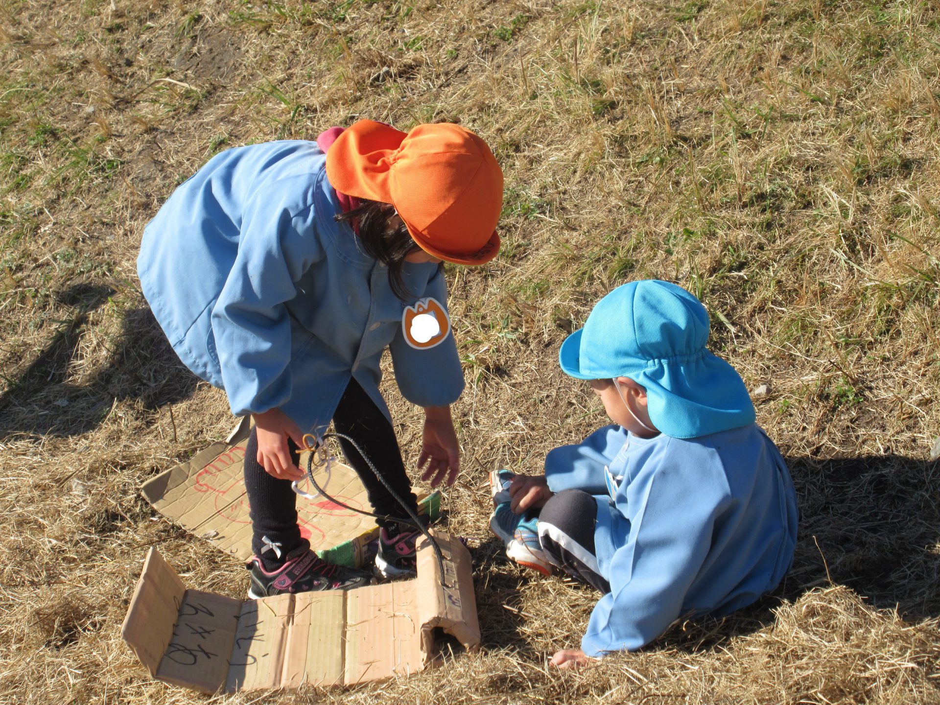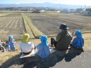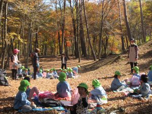 暖かい日、おにぎりを持って年中さんが遊びにいきました。秋の景色に囲まれていつも以上に食欲がすすみます! 「ここで、お昼寝したいねえ」「うん!でも嬉しくて眠れないかもしれない」子ども達のかわいい会話です。